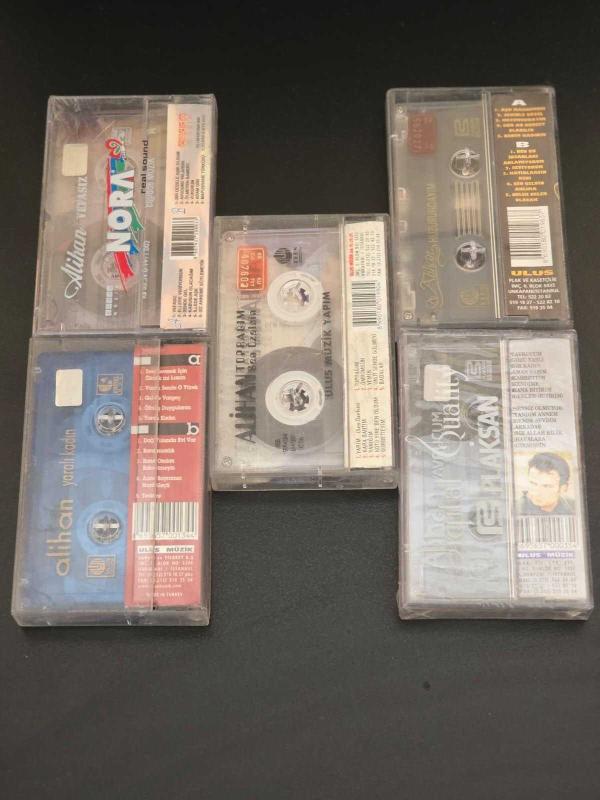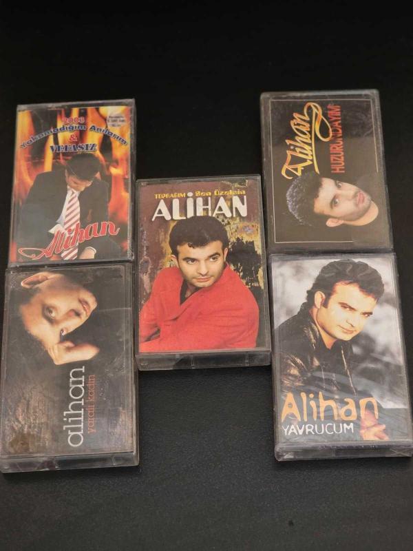 Alihan'ın Bizim Türkülerimiz, Yaralı Kadın, Vefasız, Toprağım&Sen Özelsin, Huzurundayım ve Yavrucum adlı albümlerinin jelatini açılmamış orijinal ambalajlı kaseti. Önemli Not: 3 Tanesinin ambalajı yıprandığı için fotoğraf çekiminde kötü görüntü oluşturması sebebiyle jelatinleri çıkarılmıştır.