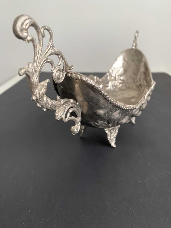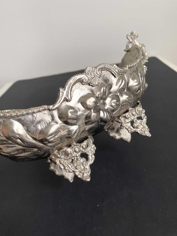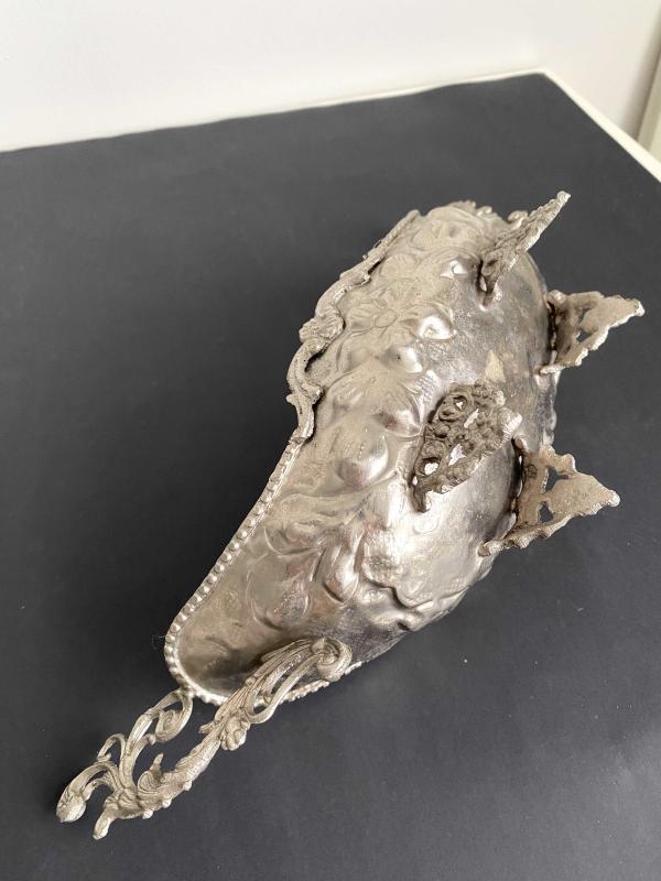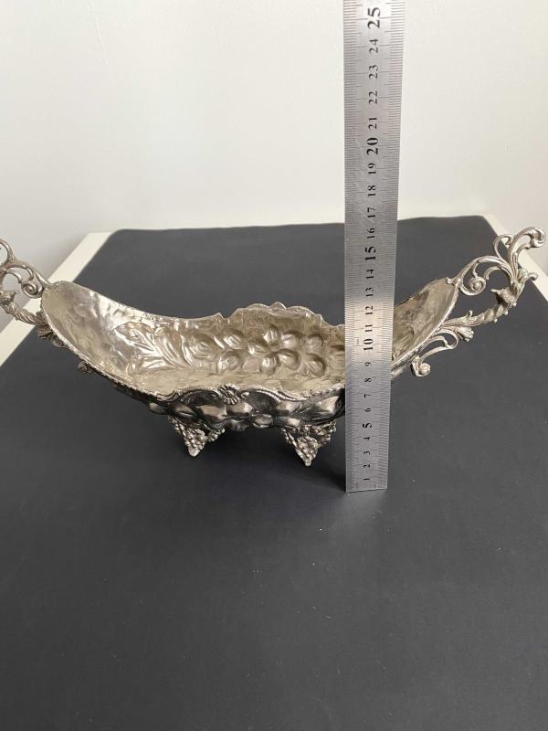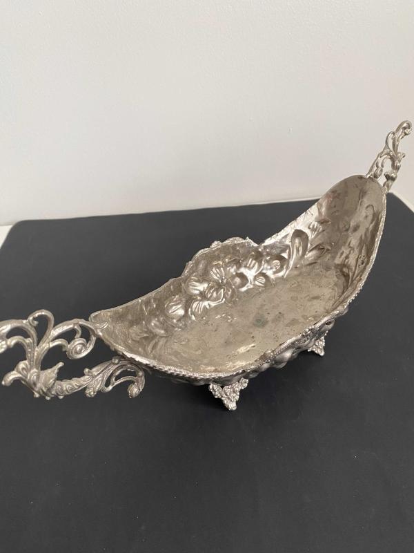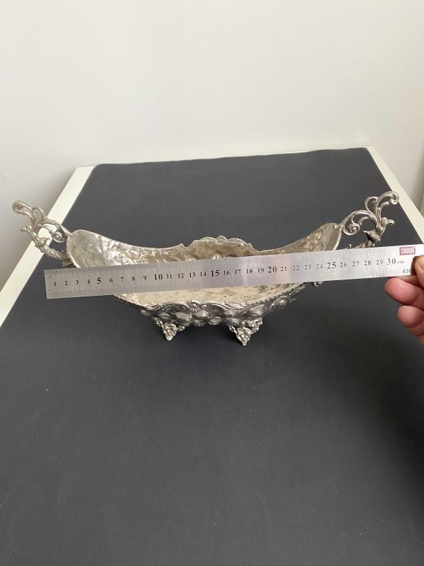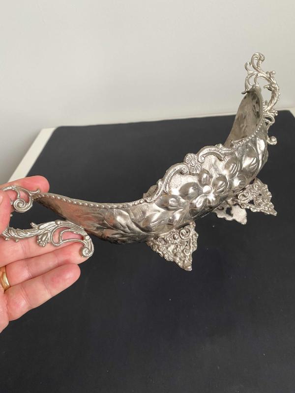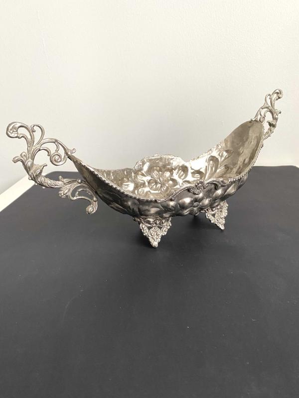 Vintage gondol şekerlik. Alman gümüşü malzemeden mamul, gofre çiçekler ve döküm ayaklar tutamaçlar… . Ebat: 33 cm Uzunluk