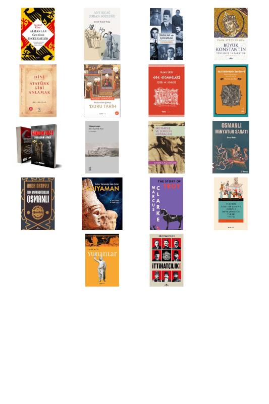 Almanlar Üzerine İncelemeler - Antikçağ Çoban Sözlüğü - Babalar ve Çocuklar - Büyük Konstantin - Dini Atatürk Gibi Anlamak - Duru Tarih - Ege Efsaneleri - Gizli Bilimlerin Serüveni - Gündem 2023 - Mezopotamya - Kadim Uygarlıklar Diyarı - Mütareke ve Sürgün Hatıraları - OSMANLI MİNYATÜR SANATI - Son İmparatorluk Osmanlı - Osmanlı'yı Yeniden Keşfetmek - Sırları Taşlarında Saklı Şehir Adıyaman (Ciltli) - The Story Of Troy - Tüketim Araştırmaları ve Osmanlı İmparatorluğu Tarihi - Yunanlar - İttihatçılık