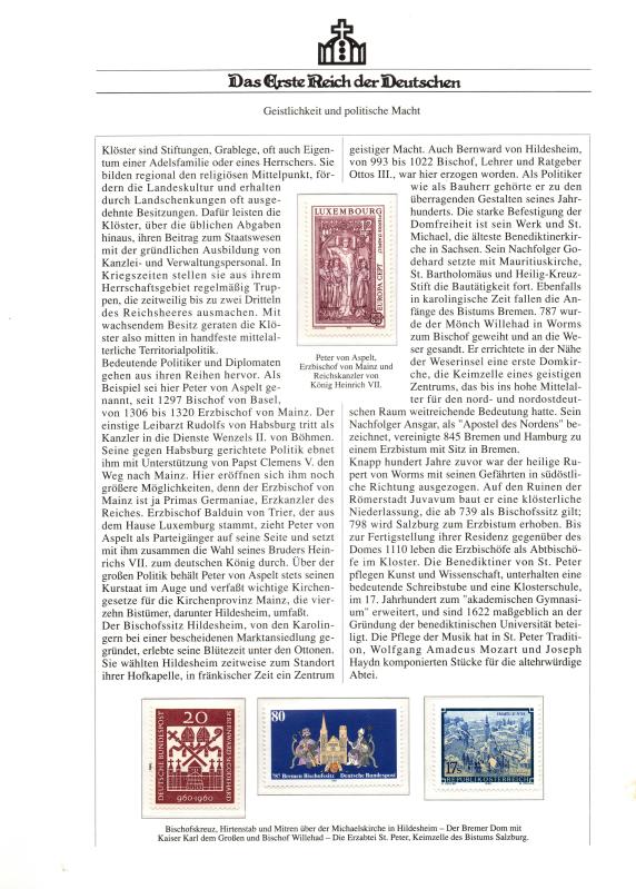 LÜKSEMBURG 18 Mayıs1978 EUROPA Pulları - Anıtlar Mainz Başpiskoposu ve Kral VII. Henry'nin Şansölyesi Peter von Aspelt, MNH 12Fr ALMANYA 6 Eylül1960 Piskoposluk St. Bernward ve St. Godehard'ın 1000. Yıldönümü Hildesheim'daki St. Michael Kilisesi'nin üzerindeki piskopos haçı MNH 20Pfg ALMANYA 16. Temmuz1987 Bremen Piskoposluk Rezidansının 1200. Yıldönümü İmparator Şarlman ve Piskopos Willehad'ın bulunduğu Bremen MNH 80Pfg AVUSTURYA 29.Haziran1989 Avusturya Manastırları Katedrali - Salzburg piskoposluğunun çekirdeği olan St. Peter Başrahipliği.MNH 17S