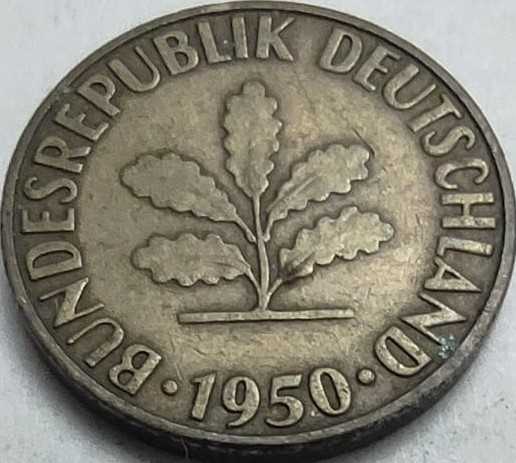 Federal Almanya'nın ilk resmi emisyonlarından biri olan bu 1950 tarihli 5 Pfennig, nümismatik dünyasında istikrarın ve yeniden doğuşun simgesidir. Paranın ön yüzünde (obverse), Alman nümismatik geleneğinin vazgeçilmezi olan ve büyümeyi temsil eden beş yapraklı meşe filizi; arka yüzünde ise iki buğday başağı arasında nominal değer "5" yer alır. Çelik çekirdek üzerine pirinç kaplama olarak üretilen bu paralar, nikel veya gümüş içermemesine rağmen dayanıklılığıyla bilinir. 1950 yılı, bu tasarımın geniş çaplı dolaşıma girdiği ilk ana tarihlerden biridir. 2002 yılında Euro'ya geçilene kadar Alman Markı'nın en sadık ufaklık birimlerinden biri olarak hafızalarda yer etmiştir.