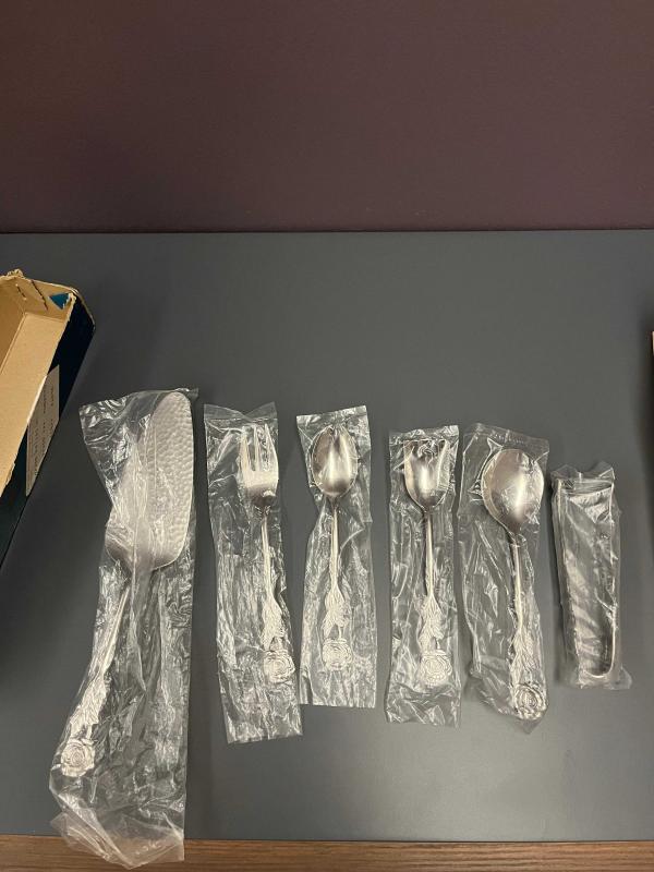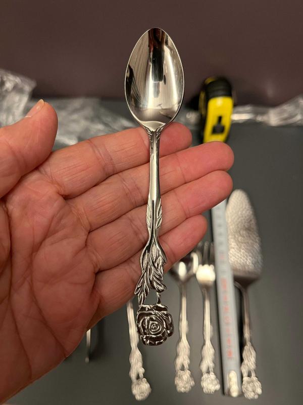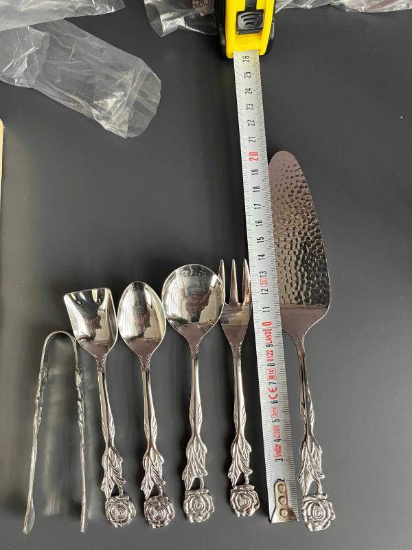 Ürün “ROSTFREI 18/8” damgalı, gül desenli 6 çatal, 6 tatlı kaşığı, 1 pasta spatulası, 1 kesme şeker maşası, 1 kürek servis kaşığı, 1 yuvarlak servis kaşığı içeren 6 kişilik pasta/tatlı takımı olarak Almanya’da satın alınmış, kullanılmamış, kutusunda muhafaza edilmiştir. Ölçüler kutulu olarak alınmıştır.