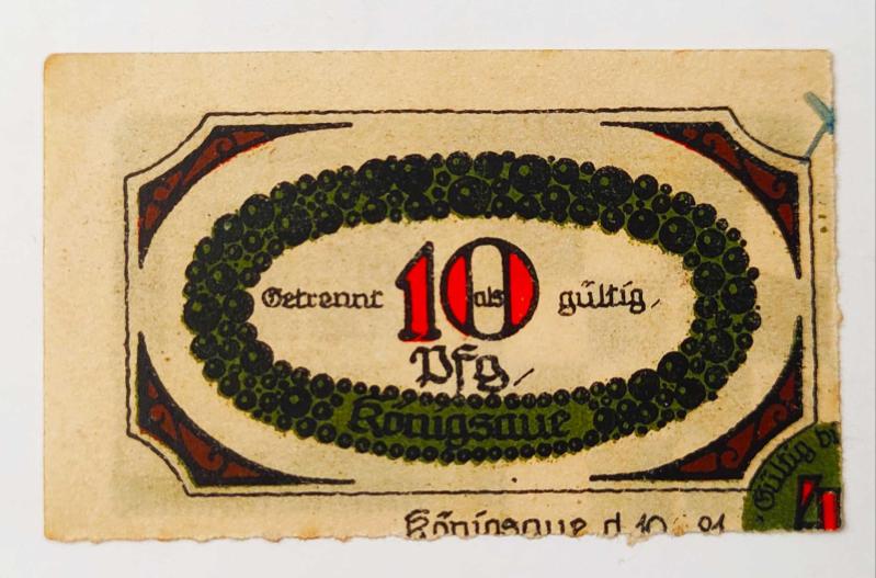 10 Pfenning Küçük Boyutlardadır.. Notgeld ve Heller'ler Alman’ların ve Avusturya’lıların zor savaş ve ekonomik kriz yıllarında ufak parçalar halinde bastırdıkları kağıt paralardır. 1. Dünya Savaşı ertesinde ülkedeki yüksek enflasyon döneminde 1919-1920'li yıllarda ortaya çıkmıştır. Ülkelerin ekonomik istikrar ve birliği sağlanana kadar kullanılmışlardır. Yabancı kaynaklarda (Acil durum parası) olarak geçer. Zor zamanlarda paraların basımlarının ve basılan paraların ülke genelinde dağıtılmasının getirdiği maliyetten kurtulmak için dönemin yönetimi artık her mahalle ve hatta köy kendi parasını bassın kararı almasıyla ortaya çıkan paralardır..