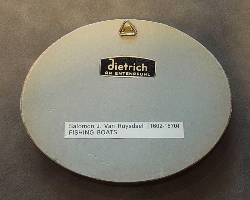 Almanya, Mini Eski Manzara Sanatı. "Balıkçı Tekneleri" Temalı Tablo. Salomon J. Van Ruysdael (1602-1670) İmzalı. Tıpkı Resim Basımıdır. Küçük Elips Çerçeveli (Camlı) Altın Varak Kaplamalı Ahşap. Duvara Monteye Uygundur. Almanya'da Üretilmiştir. (Dietrich-Am Entenpfuhl.) 1970'ler. Mükemmel Durumda. (12x10 cm) Nadir.