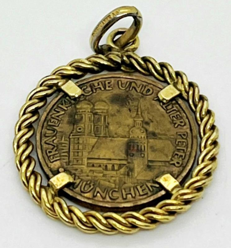 Almanya, Münih 1972 Yaz Olimpiyatları/XX Münih Olimpiyatları ve Şehir Simgeleri Temalı Hatıra Madalyon. Özel Tasarımlı Olarak Kolye Haline Getirilmiştir. Ön Yüzünde; Olimpiyat Oyunları Halkaları ve Münih Yazısı İle Tarih Yer Alır. Arka Yüzünde; Frauen Kirche/Kadınlar Kilisesi ve Münih'in En Eski Kilisesi Aziz Petrus Kilisesi Yer Almaktadır. 1972. Madalyon Kısmı; Bronz. Burmalı Kolye Çerçeve Kısmı; "Amerikaner" Damgalı Altın Kaplama. (Çok Nadir.)