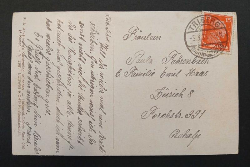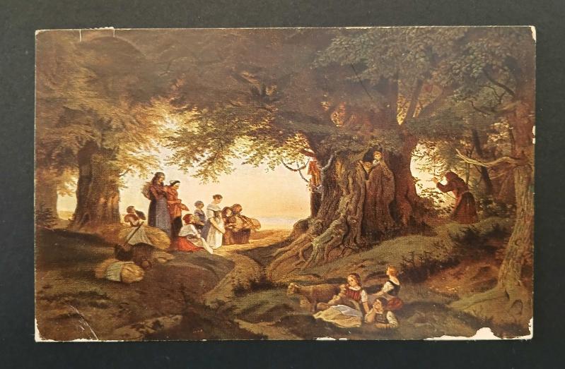 Almanya, Münih Ulusal Galeride Bulanan "Ormanda Akşam Duası" Adlı Yağlıboya Tablo 1842/Ludwig Richter (Alman Manzara Ressamı) Almanya Kırsalının Güzelliğini Yansıtan Manzara Temalı Kartpostal ve Arka Bölümde, Triberg 1923 Tarihli Postadan Geçmiş; Reich Dönemi Damgalı Pul.