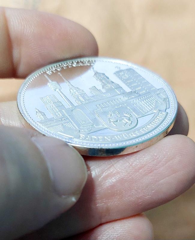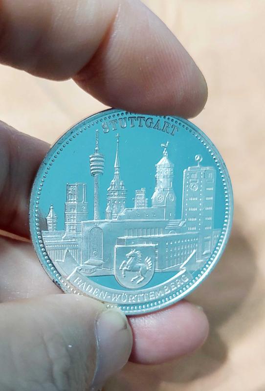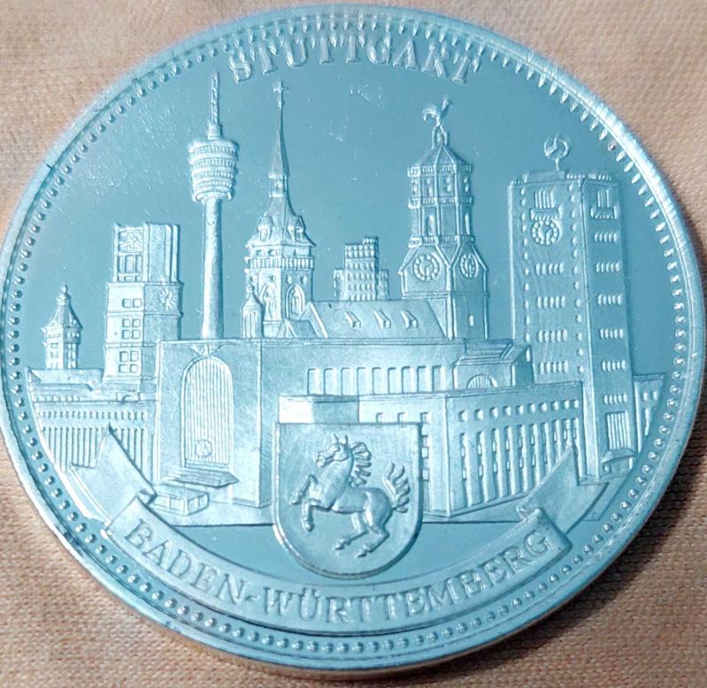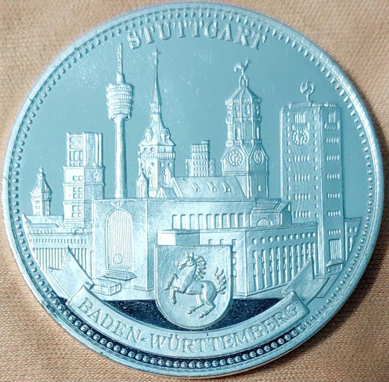 Almanya Stuttgart, Baden Württemberg Eyaleti Temalı Gümüş Kaplama Hatıra Madalya PROOF BASKI 22 gr AĞIRLIK ÖN YÜZÜNDE ALMANYA EYALET ARMALARI ARKA YÜZÜNDE STUTTGART ŞEHİR SLÜETİ BULUNMAKTADIR. ÇİL KONDİSYONDA MIKNATIS TUTMAZ.