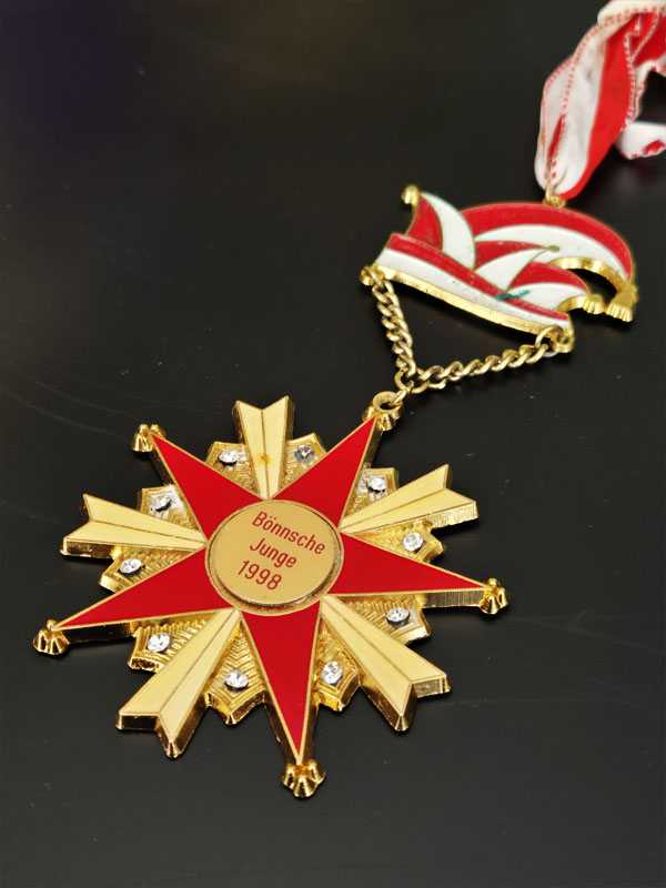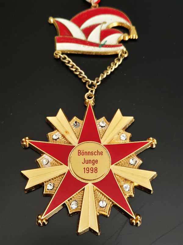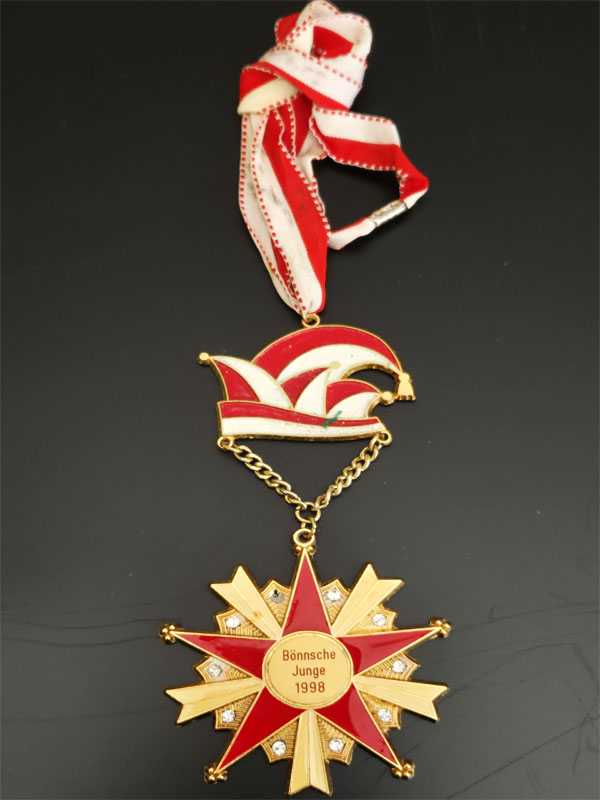 Görseldeki nesne, Almanya'nın Bonn şehrine özgü geleneksel Karnaval kutlamalarıyla (Karneval) bağlantılı bir Karnaval Madalyasıdır (Karnevalsorden). Öne Çıkan Özellikler Menşei ve Üretici: Madalyanın üzerinde yer alan "Bönnsche Junge" ibaresi Bonn şehrine atıfta bulunur. Benzer Alman karnaval madalyalarının üretimi genellikle Bonn merkezli E. Bley GmbH gibi uzman firmalar tarafından yapılmaktadır. Tarih ve Tasarım: Madalyanın merkezinde "Bönnsche Junge 1998" yazılıdır ve bu, madalyanın 1998 yılındaki karnaval sezonu için özel olarak tasarlandığını gösterir. Sembolizm: Narrenkappe (Budala Şapkası): Madalyanın üst kısmında yer alan kırmızı-beyaz şapka, Alman karnaval kültürünün en ikonik sembollerinden biridir. Yıldız Formu: Sekiz köşeli yıldız tasarımı, mine (emaye) işçiliği ve taş süslemelerle detaylandırılmıştır. Kurdele: Madalya, geleneksel karnaval renkleri olan kırmızı ve beyaz çizgili bir boyun kurdelesine bağlıdır