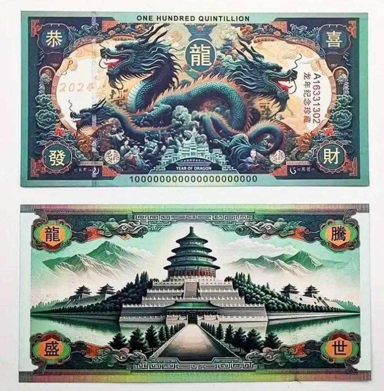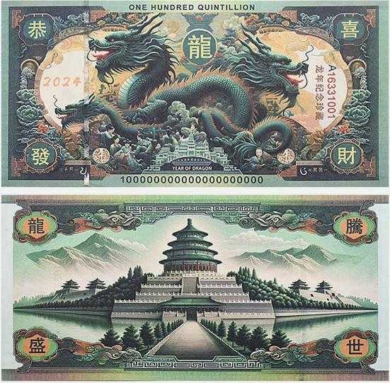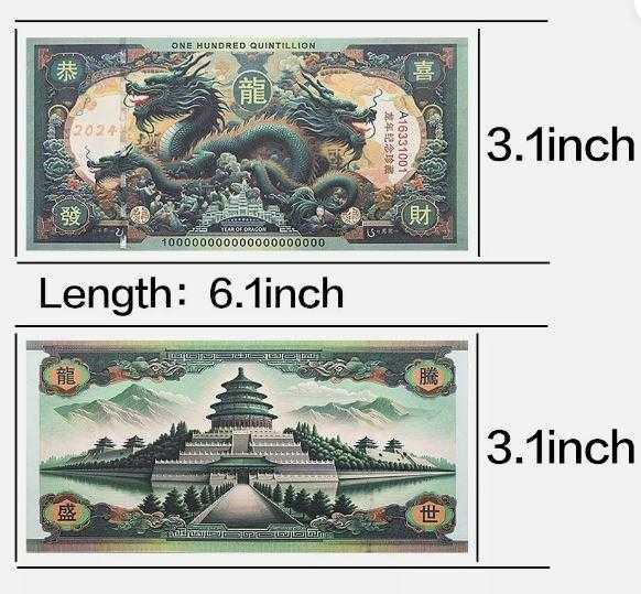 Altın Ejderha 100 Kentilyon Dolar Hatıra Para, Seri Numaralı ve kontrol jelatin bantlıdır. Mor ışık altında gizli desenler gözükür. Soguk mühür vardır. 153x78mm ebatındadır. Çok güzel bir koleksiyon ögesidir. Temiz kondüsyondadır.