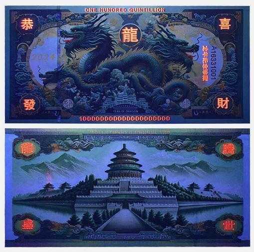 Altın Ejderha 100 Kentilyon Dolar Hatıra Para, Seri Numaralı ve kontrol jelatin bantlıdır. Mor ışık altında gizli desenler gözükür., en son 7 ay önce güncellenmiştir.