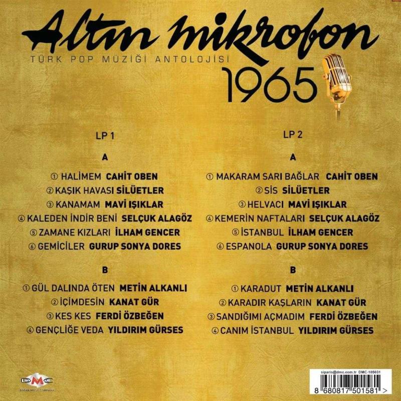 ALTIN MİKROFON 1965 LP 1 A Yüzü: 1 – CAHİT OBEN – HALİMEM 2 – SİLÜETLER – KAŞIK HAVASI 3 – MAVİ IŞIKLAR – KANAMAM 4 – SELÇUK ALAGÖZ – KALEDEN İNDİR BENİ 5 – İLHAM GENCER – ZAMANE KIZLARI 6 – GURUP SONYA DORES – GEMİCİLER B Yüzü: 1 – METİN ALKANLI – GÜL DALINDA ÖTEN 2 – KANAT GÜR – İÇİMDESİN 3 – FERDİ ÖZBEĞEN – KES KES 4 – YILDIRIM GÜRSES – GENÇLİĞE VEDA LP 2 A Yüzü: 1 – CAHİT OBEN – MAKARAM SARI BAĞLAR 2 - SİLÜETLER – SİS 3 – MAVİ IŞIKLAR – HELVACI 4 – SELÇUK ALAGÖZ – KEMERİN NAFTALARI 5 – İLHAM GENCER – İSTANBUL 6 – GURUP SONYA DORES – ESPANOLA B Yüzü: 1 – METİN ALKANLI – KARADUT 2 – KANAT GÜR – KARADIR KAŞLARIN 3 – FERDİ ÖZBEĞEN – SANDIĞIMI AÇMADIM 4 – YILDIRIM GÜRSES – CANIM İSTANBUL