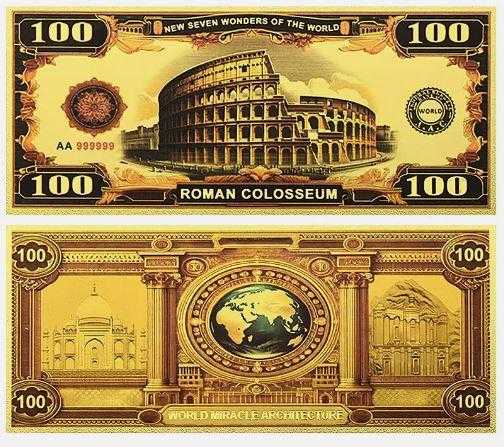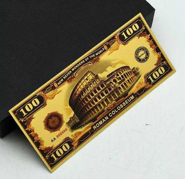 Altın Varak 100 Dolar, Dünyanın yedi Harikası serisi, Kolezyum Koleksiyonluk Ölçüleri:155x65mm. Şeffaf föyde gönderilecektir.