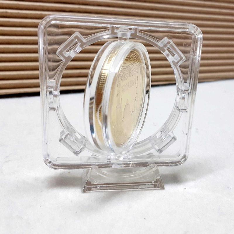 BESMELE YAZILI ALTIN KAPLAMA HATIRA PARA Döner standlıdır.Orta bölüm 360 derece dönmektedir.Masa üstünde sergilenebilir. HAVA ALMAZ ŞEFFAF , AİRTİGHT KAPSÜLDE 4cm çapında ve 32gram ağırlığındadır.