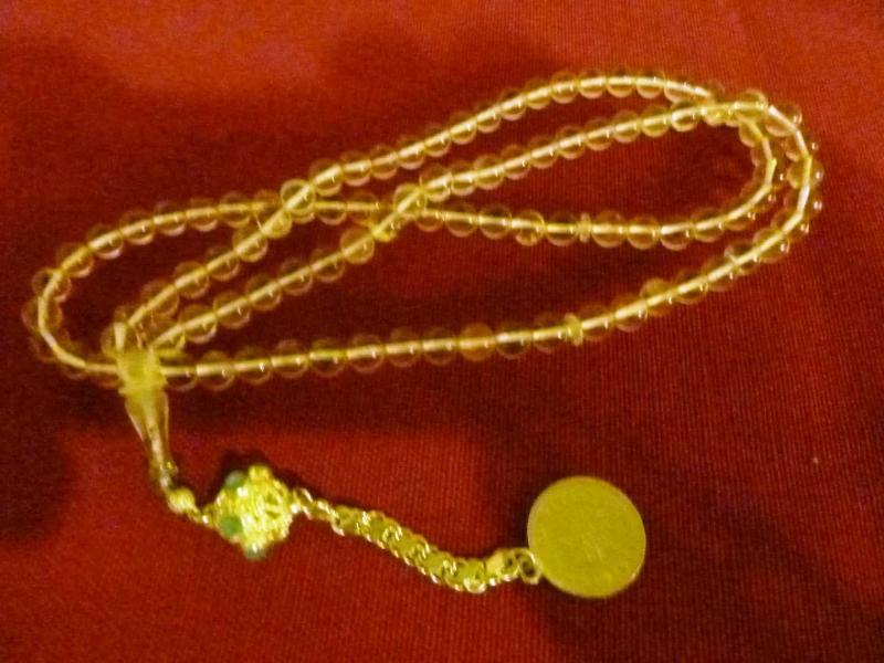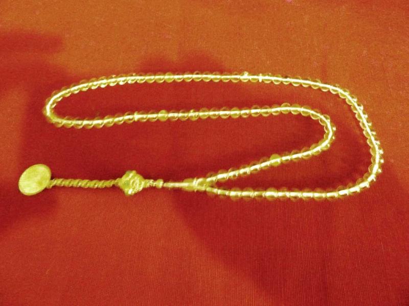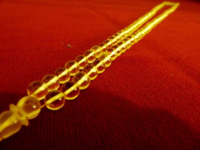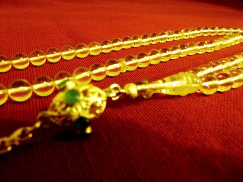 Altın kaplama püsküllü, küre kesim, usta işi, ateş kehribar 99'luk tesbih. Püskül dahil. 43cm., 3 yıl önce kitantik’te satışa sunulmuştur.