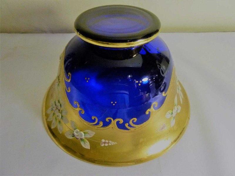 Altın yaldız ve mine işlemeli Bohem lacivert el boyaması meyvelik Y:14cm. Ağız çapı: 24cm. başlıklı antika/koleksiyon objesinin menşei belirtilmemiştir. Objenin ait olduğu dönem bilinmeketedir.