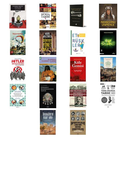 Amansız Devrim Kapitalizm Tarihi - Ana Hatlarıyla Dünya Tarihi - 1 - Anadolu Neolitik Mutfak Kültüründe Kaşıklar - Arabistanlı Lawrence - Barışa Son Veren Savaş - Dünyayı Yönetmek - Etrüskler - Gizemli Olaylar - Hitler İmparatorluğu - KADININ YAZISIZ TARİHİ - Köle Gemisi - Kısa İtalya Tarihi - Ortadoğu'da Zanaatlar ve Zanaatkârlar - Osmanlı Hanedanının Yapısı - Trakya Milli Mücadele Tarihi Malta Hatıratı ve Malta'da Türkler - Türk Devrim Tarihi 101 - Türkistan'ın Keşif Çağı - İmparatorluklar Çağı’nın Büyük Komutanları (1583-1865)