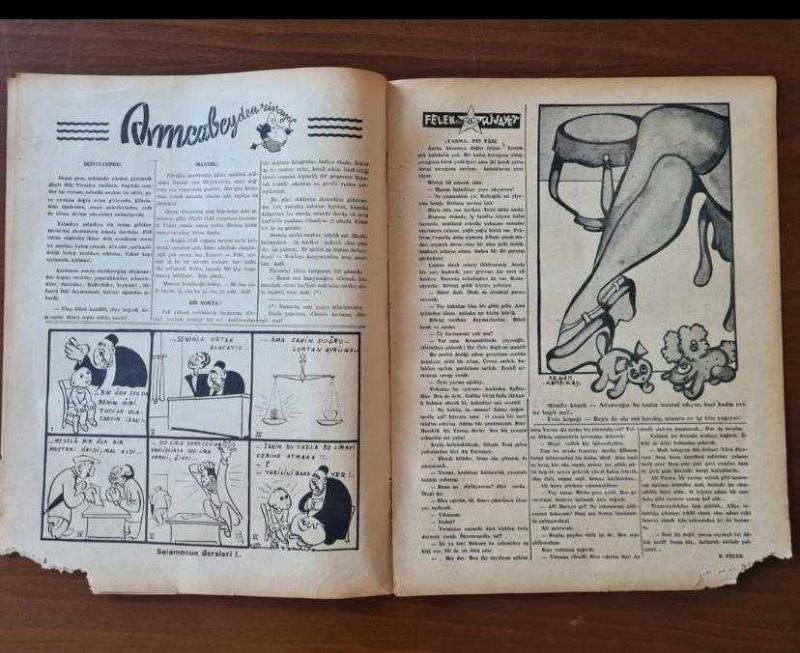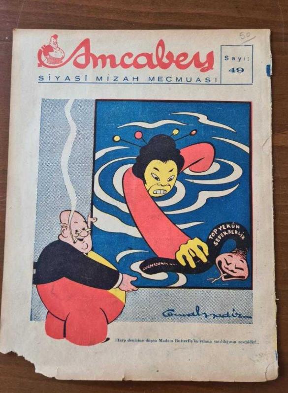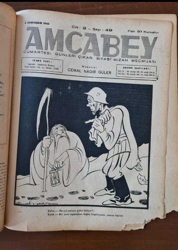 Orijinal 6 Kasım 1943 tarihli, Amcabey “Siyasi Mizah Mecmuası” Cilt: 2, Sayı: 49 nüshasıdır. Müessis ve baş çizer: Cemal Nadir Güler. Bu sayı, II. Dünya Savaşı yıllarında Türkiye’deki siyasi mizah iklimini ve savaş propagandasını yansıtan, oldukça çarpıcı kapak karikatürleriyle öne çıkan nadir bir örnektir. Öne çıkan özellikler: Kapakta, Nazizm’e karşı eleştirel bir propaganda karikatürü yer almakta; swastika’lı tokmakla “propaganda” figürüne vurulurken, müttefikleri simgeleyen karakterler kullanılmıştır. Diğer kapakta (arka/alternatif kapak), Japonya’yı simgeleyen figür ve “Topyekûn Seferberlik” yılanı ile dönemin Pasifik cephesi ve savaş psikolojisi ele alınmıştır. İç sayfalarda: Cemal Nadir imzalı geniş karikatürler “Bir tâlih kurbanı!” başlıklı hikâye “Banker Arif” – Amcabey’in Mizahî Romanı (tefrika) Günlük hayata ve siyasete dair kısa karikatürler, çizgi bantlar ve mizah yazıları bulunmaktadır. İlk sayfalarda, Kırım cephesine gönderme yapan, “Tarih” ve asker figürlü bir büyük karikatür de yer alır. Tarihî ve koleksiyon değeri: 1943 tarihli, savaş yıllarına ait Türkçe siyasi mizah dergisi olması sebebiyle hem Türk basın tarihi, hem de Cemal Nadir koleksiyonları,II. Dünya Savaşı / propaganda karikatürleri,alanlarında ilgi çekici bir parçadır. Amcabey, Akbaba kadar yaygın olmayan, baskı adedi ve korunmuş nüsha sayısı görece az bulunan bir mizah mecmuasıdır. Bu sayı, özellikle savaş temalı kapağı nedeniyle koleksiyonerler tarafından aranan nüshalar arasındadır. Kondüsyonu: Good / koleksiyonluk okunur kondisyon” – müzayede terimiyle G–VG aralığı.