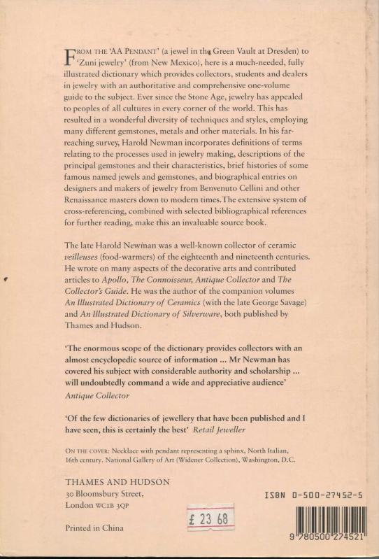 An Illustrated Dictionary of Jewelry - 2530 Terms Relating to Gemstones, Jewels, Materials, Processes, Styles, Designers and Makers from Antiquity to the Present Day From the 'AA Pendant' (a jewel in the Green Vault at Dresden) to 'Zuni jewelry' (from New Mexico), this popular reference work provides collectors, students and dealers in jewelry with an authoritative fully-illustrated guide to the subject.Harold Newman, who was a famous collector and writer on the decorative arts, incorporates definitions of terms relating to the processes used in jewelry making, descriptions of the principal gemstones and their characteristics, brief histories of famous named jewels and gemstones, and biographical entries on designers and makers of jewelry from the Renaissance to modern times.With its extensive cross-referencing and selected bibliographical references for further reading, this volume has no rival.