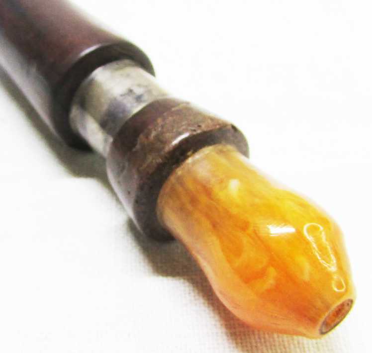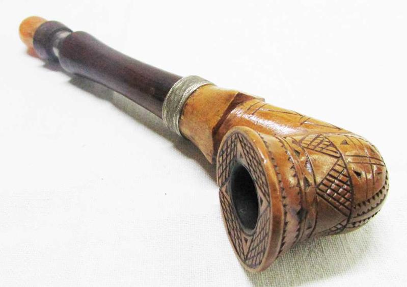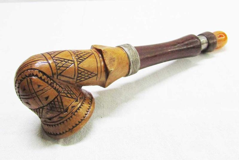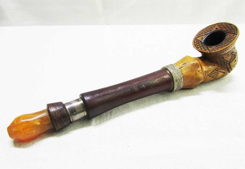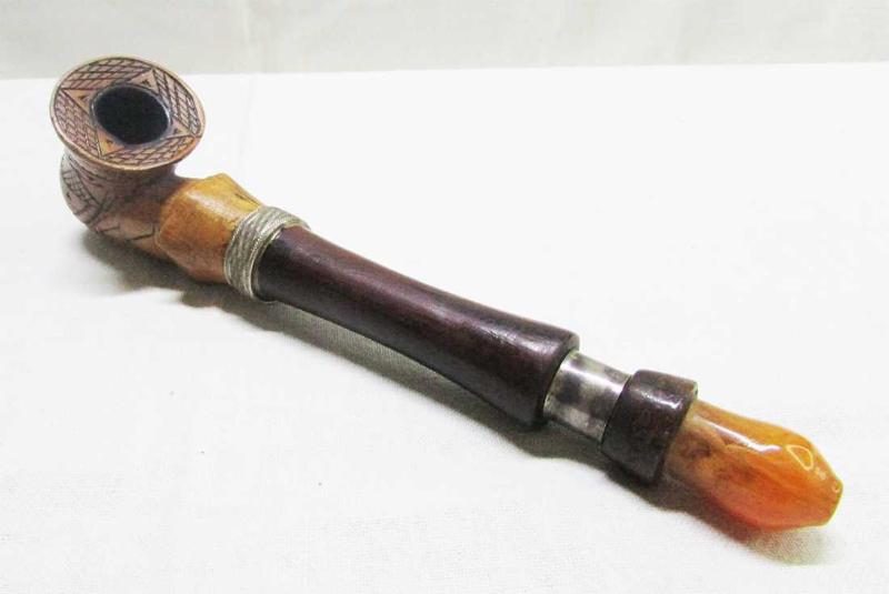 ANTİKA ÇOK ÖZEL İŞÇİLİKLİ AĞAÇ PİPO, EMZİK KISMI SIKMA KEHRİBARDIR, SAP ORTA KISMI GÜL AĞACINDAN, SÜPER İŞLEMELİ HAZNE KISMININ AĞAÇ CİNSİNİ ANLAYAMADIM, TOPHANE LÜLELERİNE BENZİYOR, BİLEZİKLER GÜMÜŞ YA DA GÜMÜŞ KAPLAMA, DETAYLAR ÜRÜN RESİMLERİNDE, HAZNE GENİŞLİĞİ 36mm;YÜKSEKLİĞİ 42mm,ORTA AĞAÇ KALINLIĞI 17mm, UZUNLUĞU 19,5cm