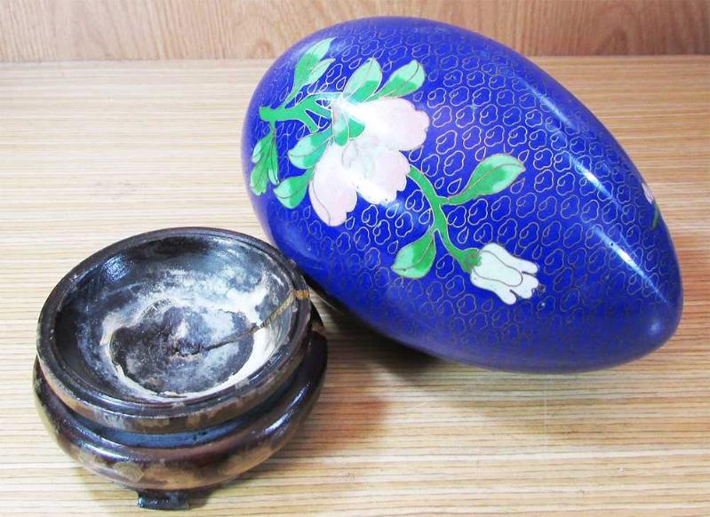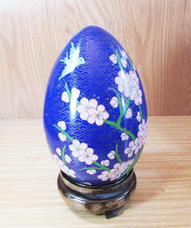 ANTİKA, CLOİSONNE MİNELİ HARİKA DEKORLU BRONZ YUMURTA, AHŞAP STANDLI, SAĞLAM VE TEMİZ, SADECE BİR UFAK YERİNDE BELLİ BELİRSİZ BİR VURUĞU VAR, DETAYLAR ÜRÜN RESİMLERİNDE, YAKLAŞIK GÖBEK GENİŞLİĞİ 11cm, STANDLI YÜKSEKLİK 18,5cm