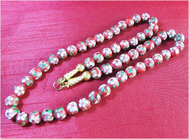 ANTİKA, CLOİSONNE TESBİH ÇOK GÜZEL KOLYE, BRONZ ÜZERİ MİNE İŞLEME SANATLI VE ALTIN VERMEYLİ, KLİPSLERİ YAKIN DÖNEMDE YENİLENMİŞ SAĞLAM VE TEMİZ, TANE ÇAP KALINLIKLARI 9-9,5mm TEK SIRA UZUNLUĞU 58cm