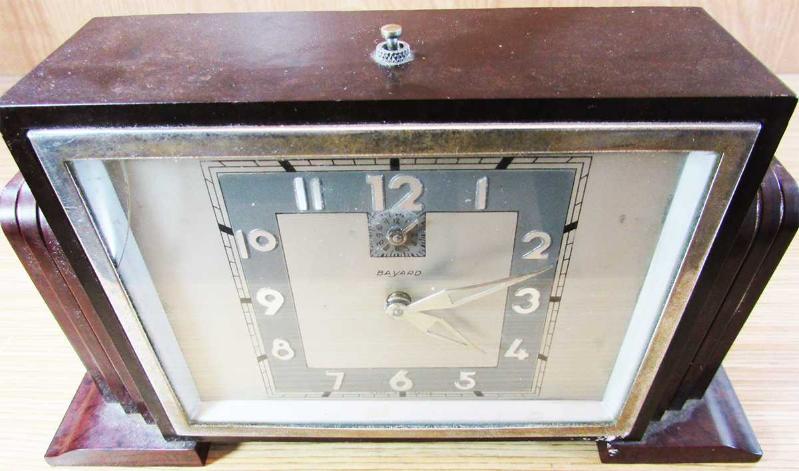 KOLEKSİYONLUK, 1930 LARDAN, FRANSA İMALATI "BAYARD" KURMALI ÇALAR MASA SAATİ, ART DECO,BAKALİT KASALI, MEVCUDU İLE SAĞLAM VE TEMİZ, KIRIK,ÇATLAK YOK,SORUNSUZ ÇALIŞIR VAZİYETTE, KALINLIĞI 5cm,YÜKSEKLİĞİ 12,5cm,GENİŞLİĞİ 22,5cm