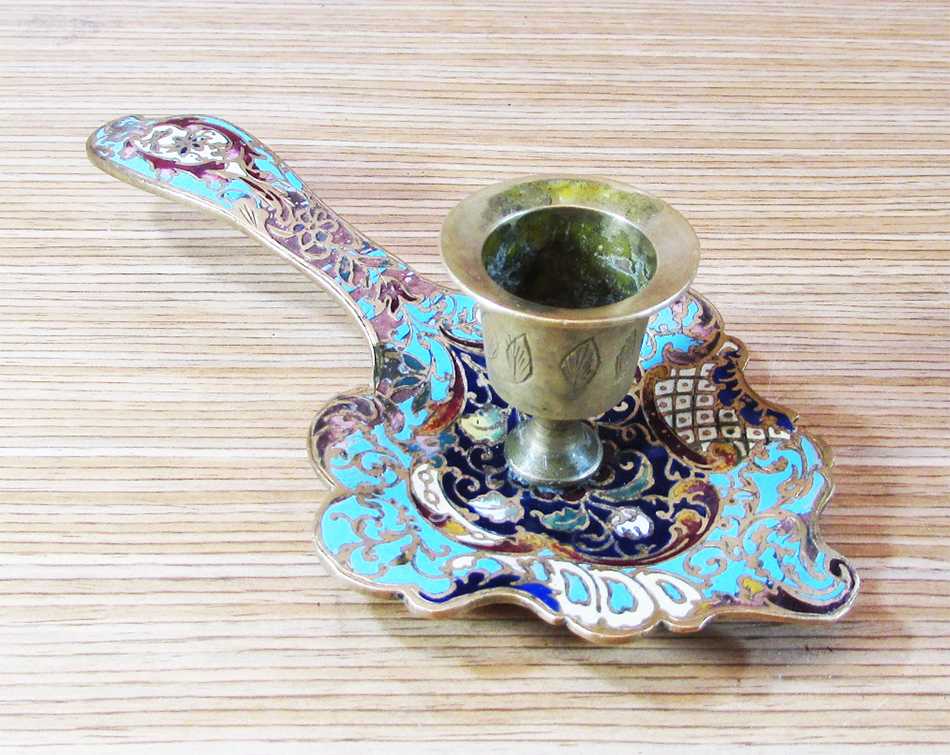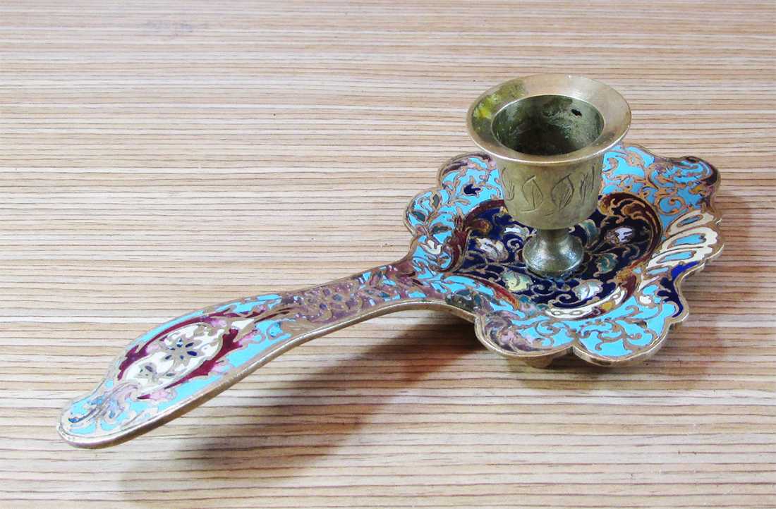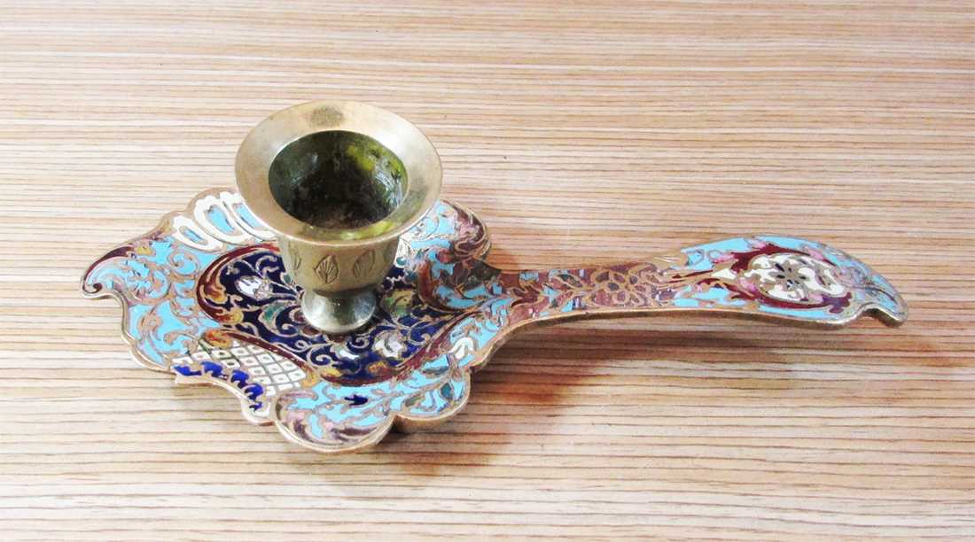19.YY ANTİKA 3.NAPOLYON DÖNEMİ, FRANSIZ CHAMPLEVE MİNELİ PİRİNÇ EL MUMLUĞU, KOLEKSİYONLUK,SAĞLAM VE OLDUKÇA İYİ KONDÜSYONDA, KALIN VE AĞIR YAPILI, DETAYLARI ÜRÜN RESİMLERİNDE, YÜKSEKLİĞİ 5cm,ÇANAK GENİŞLİĞİ 8cm, UZUNLUĞU 16cm