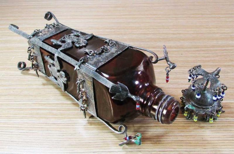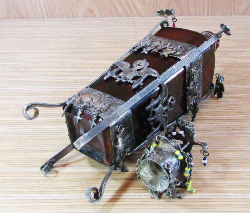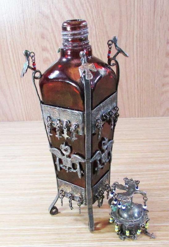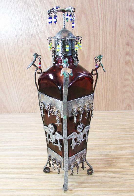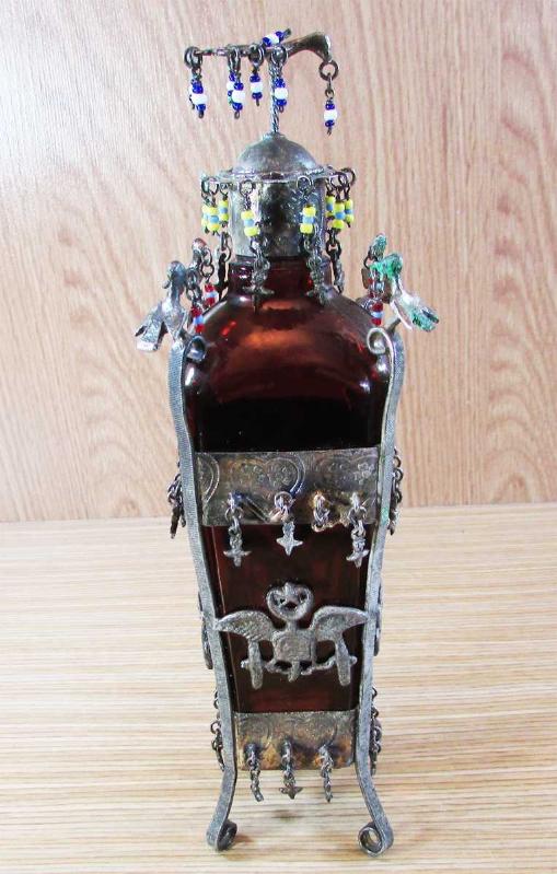 ANTİKA, HİCAZ İŞİ ÇOK İLGİNÇ VE GÜZEL KOKU ŞİŞESİ, BOL KUŞLU,AY-YILDIZLI VE SALLANTILI,ÜZERİ GÜMÜŞ KAPLAMA ALPAKA GİYDİRMELİ, MEVCUDU İLE SAĞLAM VE TEMİZ,NADİR BİR KOLEKSİYONLUK ÜRÜN, DETAYLAR ÜRÜN RESİMLERİNDE, YÜKSEKLİĞİ 22cm