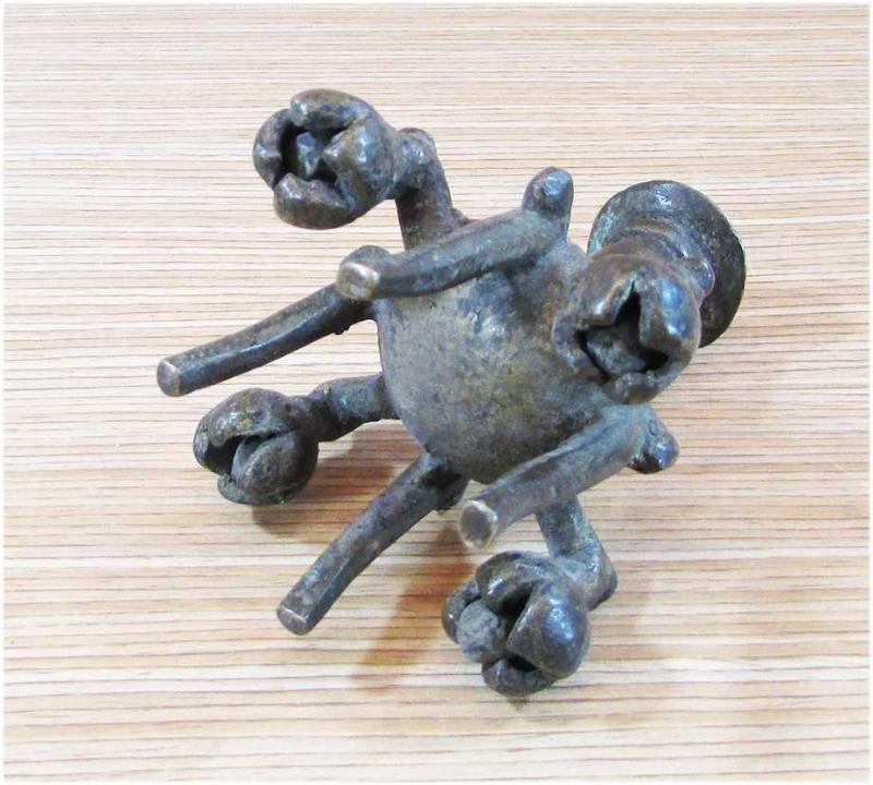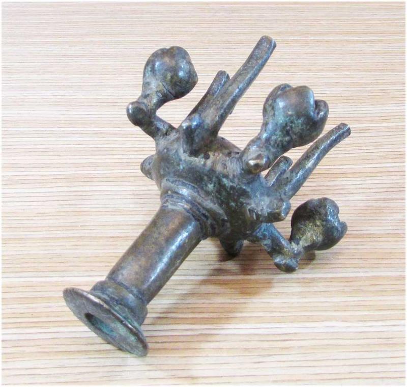 OSMANLI DÖNEMİ,BÜYÜK İHTİMALLE ERKEN DÖNEM ÇOK YAŞLI ANTİKA BRONZ HATTAT MUMLUĞU-ŞAMDANI AĞIR VE DOLU YAPILI,İLGİNÇ BİR ŞEKİLDE,ALTTAKİ DÖRT TOPÇUĞUNUN İÇİNE MİNİK TOPLAR YERLEŞTİRİLMİŞ,SALLANINCA SES ÇIKARIYOR, SAĞLAM VE GAYET İYİ KONDÜSYONDA TABAN GENİŞLİĞİ 8,5cm,YÜKSEKLİĞİ 10cm