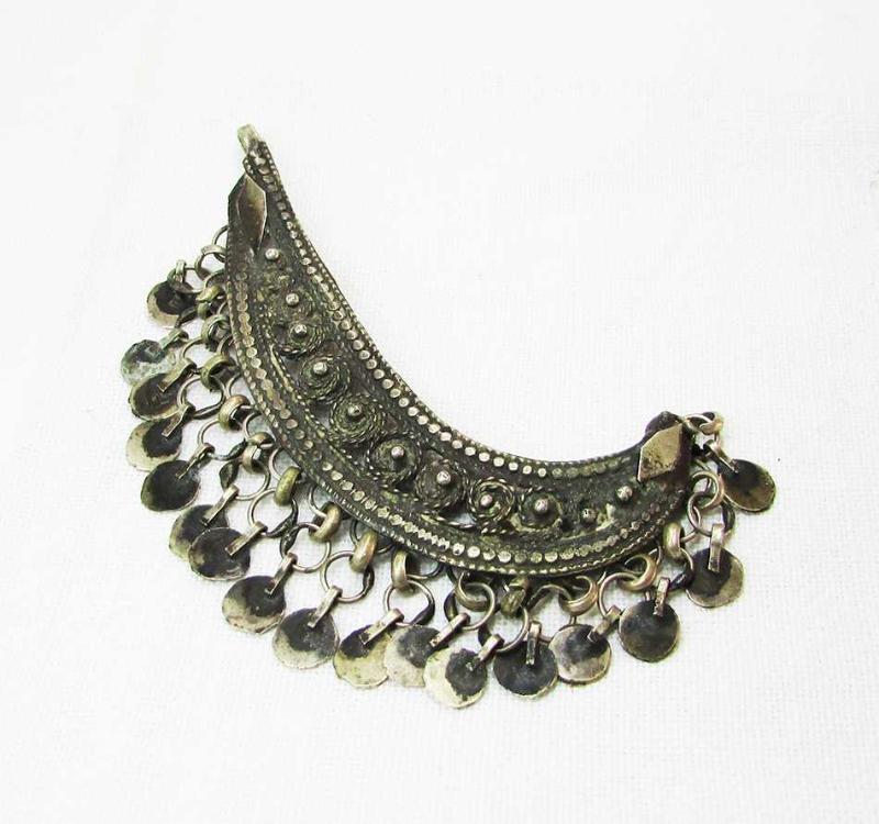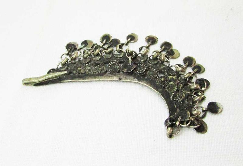 ANTİKA OSMANLI TELKARİ İŞLİ ÇOK GÜZEL GÜMÜŞ KADIN BAŞ-FES SÜSÜ CINGILLI GENİŞLİĞİ YAKLAŞIK 3cm,YÜKSEKLİĞİ 7,5cm AĞIRLIĞI 13,2gr MEVCUDU İLE SAĞLAM VE ÇOK İYİ KONDÜSYONDA