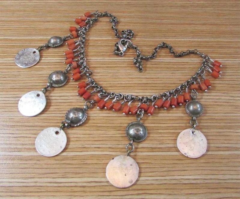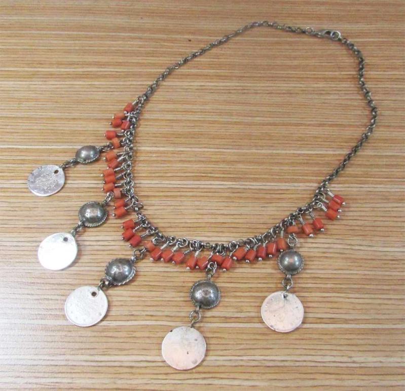 ANTİKA OSMANLI GÜMÜŞ KOLYE, GÜMÜŞ 5 KURUŞLU VE MERCANLI, SAĞLAM VE TEMİZ, UZUNLUĞU 45cm,AĞIRLIĞI 36gr