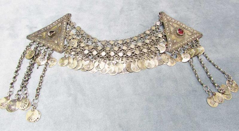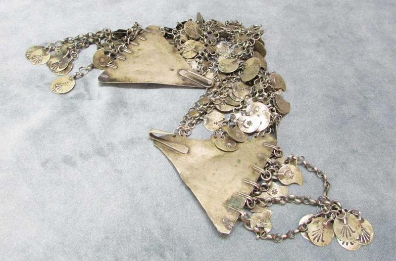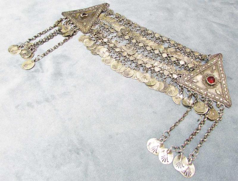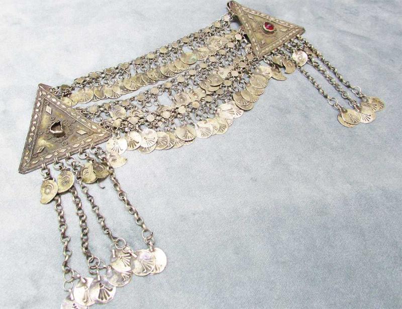 ANTİKA OSMANLI KADIN FESİ ÖN SÜSÜ DÜŞÜK AYAR VE ALPAKA YAPILI, CINGIL UÇLARININ BİR KISMI AY-YILDIZLI, MEVCUDU İLE SAĞLAM VE ÇOK İYİ KONDÜSYONDA DETAYLARI ÜRÜN RESİMLERİNDE CINGILLARI HARİÇ ÜÇGENLERİN GÖVDE YÜKSEKLİĞİ 6cm,KOMPLE GENİŞLİĞİ 22,5cm AĞIRLIĞI 74gr