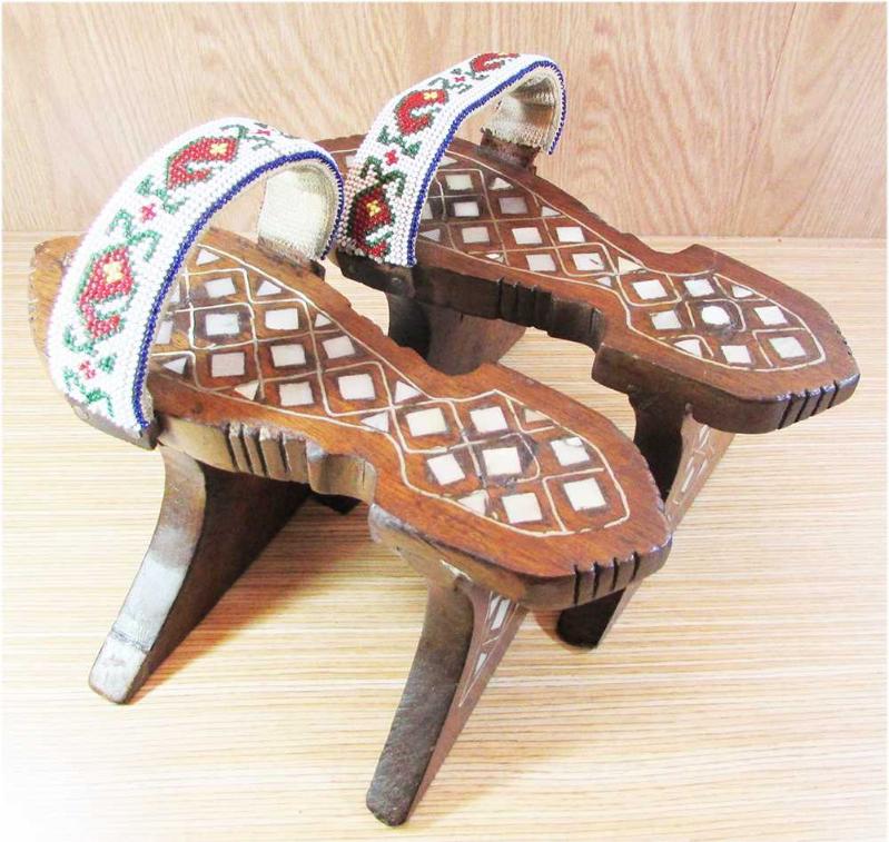 ANTİKA, OSMANLI DÖNEMİ,AĞAÇ ÜZERİ SEDEF KAKMALI, YÜKSEK TAKUNYALAR-NALINLAR, TAHMİNİ 70-80 YIL EVVELİ,KOPAN YA DA BOZULAN ÜST BANT KUŞAKLARI YENİLENMİŞ, YERİNE DÖNEMİNİN TAŞ BONCUK EL İŞİ YENİ BANTLAR TAKILMIŞ, MEVCUDU İLE SAĞLAM VE YÜSEK KONDÜSYONLU ÜRÜN, AĞAÇ KISMIN YÜKSEKLİKLERİ 12cm,UZUNLUKLARI 23cm
