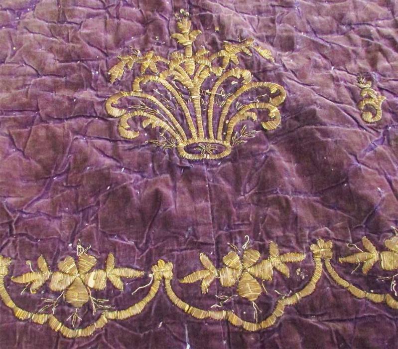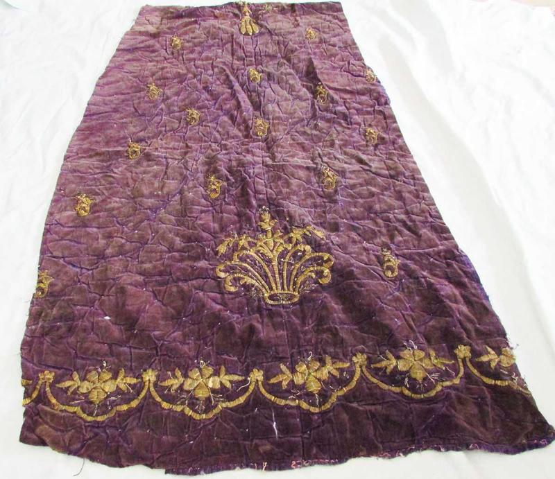 ANTİKA OSMANLI DÖNEMİ GERÇEK GÜMÜŞ SIRMALI BİNDALLI İŞLEMELİ KADİFE PARÇA SANIRIM BİR ELBİSEDEN ÇIKARILMIŞ BİR YÜZYILI DEVİRELİ ÇOK OLMUŞ ARKASI ASTARLI PANOLUK VEYA APLİKELİK GÜMÜŞ SIRMALARI HALİ İLE KARARMA YAPMIŞ UYGUN VE YUMUŞAK BİR FIRÇANIN SÜRTÜLMESİ İLE TEKRAR PARLAKLIĞINA KAVUŞACAKTIR ÜST VE ALT GENİŞLİKLERİ 45-70cm YÜKSEKLİĞİ 128cm