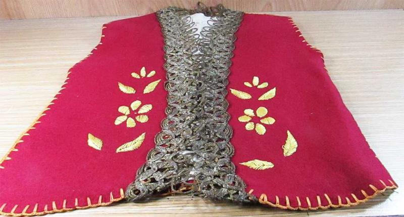ANTİKA, OSMANLI DÖNEMİ, ÇUHA KUMAŞ ÜZERİ İPEK İBRİŞİM İŞLEMELİ, ÖN VE YAKA KENARLARI DOLU DOLU ALTIN RENK TEL ÖRGÜLÜ, HARİKA ÇOCUK YELEĞİ, ARKASI DÜZ VE HER TARAFI GİBİ TERTEMİZDİR, İÇİ ASTARLIDIR,