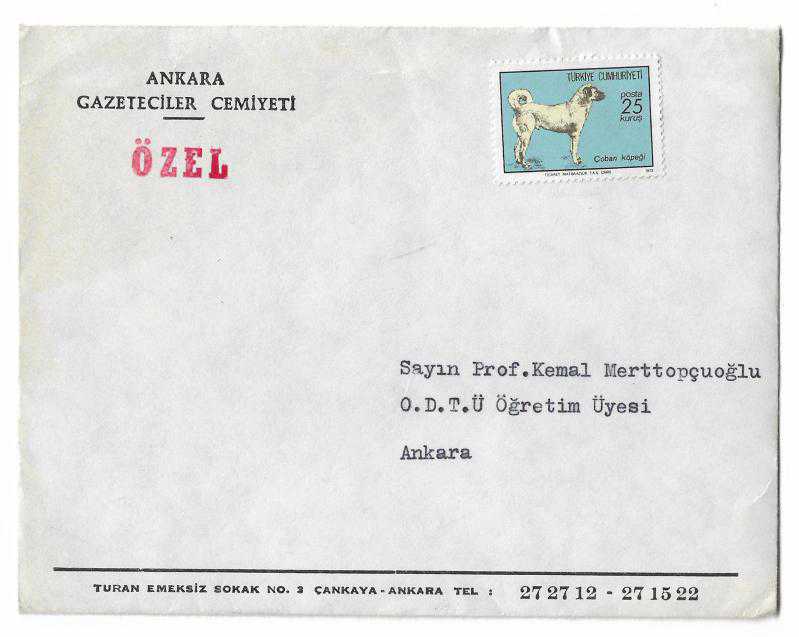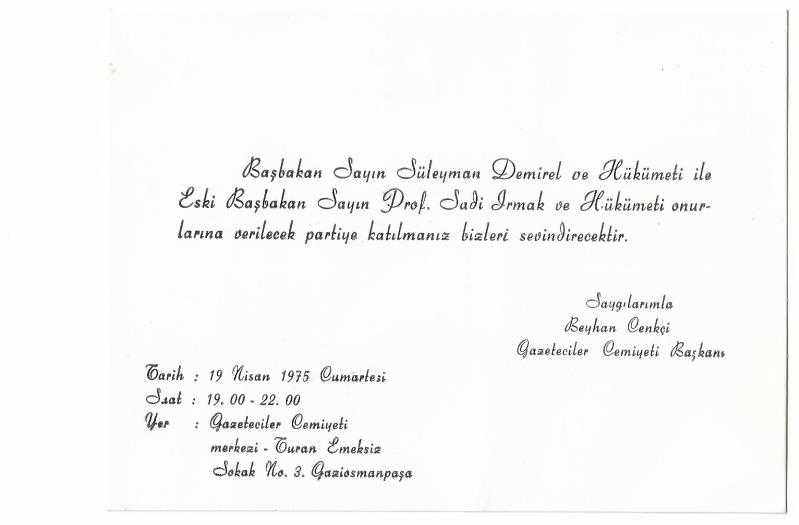 Ankara Gazeteciler Cemiyeti'nin özel damgalı toplantı davetiyesi, 19 Nisan 1975 tarihli.