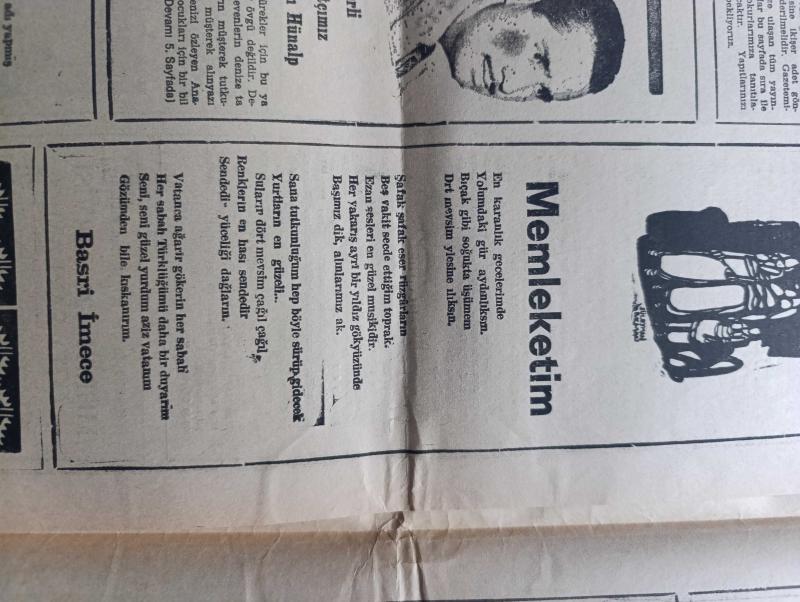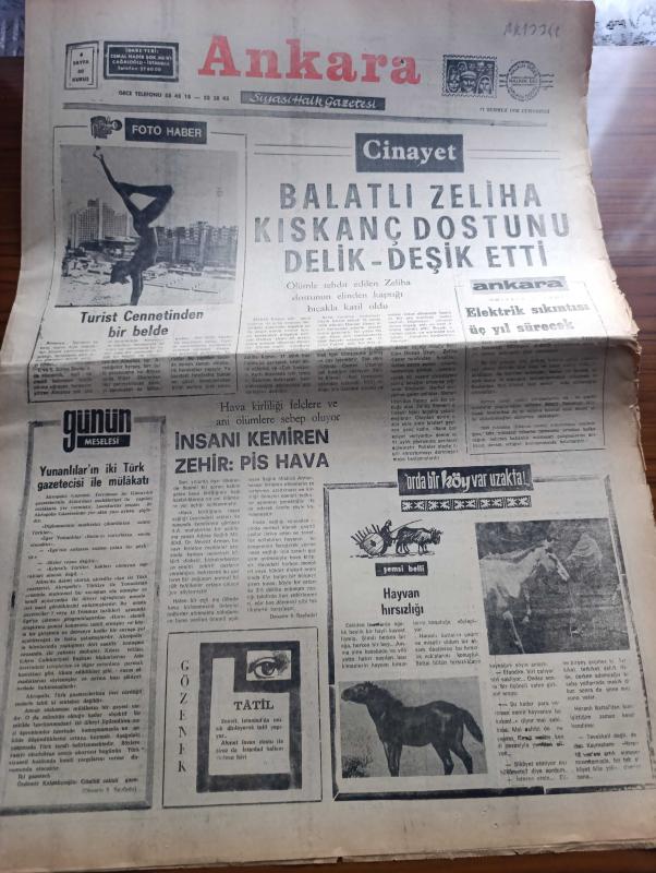 Ankara Gazetesi - Turkish Newspaper - 17 Temmuz 1976 - günün meselesi Yunanlıların iki Türk gazetecisi ile mülakatı - Balatlı Zeliha kıskanç dostunu delik deşik etti - insanı kemiren zehir pis hava - hayvan hırsızlığı yazan Şemsi Belli - bebek belediye gazinosunda Belkıs Özener Fatma Belgen Mut Folklor Ekibi ve Serpil Barlas - Kalamış köşkte Hale Manzade Gönül Gül Atilla Yelken - Florya belediye gazinosunda Sevim Deran Nükhet Duru Altan Karındaş - hurafelerle öldürülen inançlar yazan Edip Kemal - Türk tarımının gelişmesi için 60 bin traktöre ihtiyaç var - Bu gece 1976 Montreal olimpiyatlarının açılış törenini izleyeceksiniz - Anasının kızı filmi başrolde Tamer Yiğit Alkazar sinemasında - küçük bey filmi başrolde Ahmet Özhan Şan sinemasında - Ateş böceği filmi başrolde Tarık Akan Saray sinemasında - Sait Faik'in bütün insanlara selamı var yazan Ayhan Hünalp - pasaport şiiri yazan Fazıl Hüsnü Dağlarca - memleketim şiiri yazan Basri İmece - Yunanistan'daki Türk casusları VI - Be Be çocuk adlı eser, Kitap > Süreli Yayınlar > Gazeteler > Türkiye > Genel > Günlük kategorisinde İkinci El olarak satıştadır.