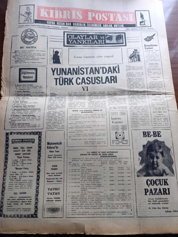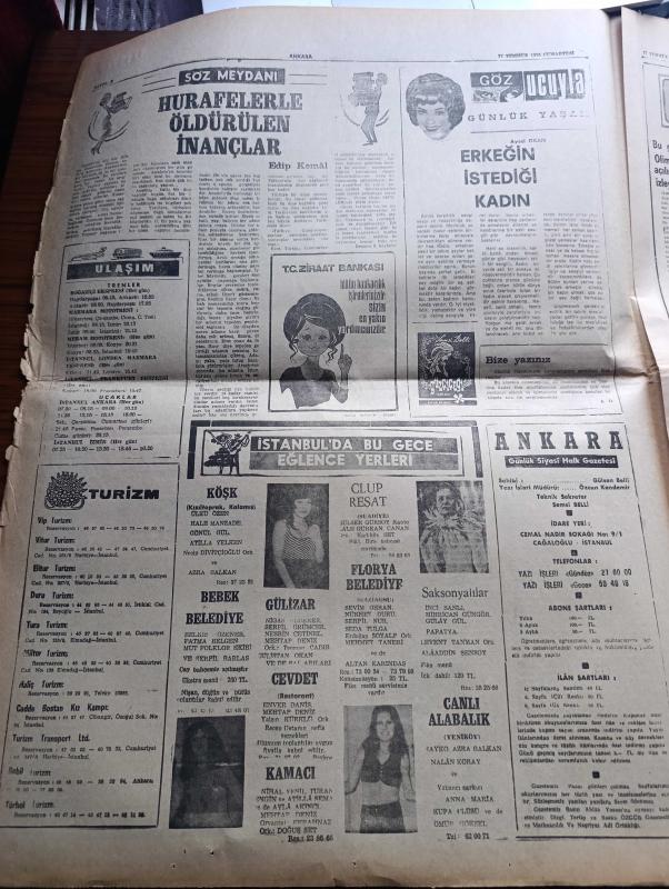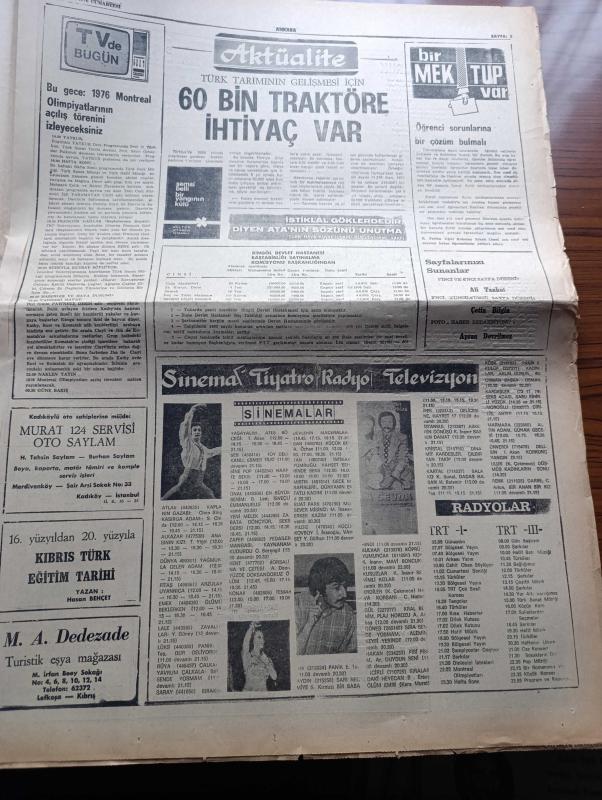 Ankara Gazetesi - Turkish Newspaper - 17 Temmuz 1976 - günün meselesi Yunanlıların iki Türk gazetecisi ile mülakatı - Balatlı Zeliha kıskanç dostunu delik deşik etti - insanı kemiren zehir pis hava - hayvan hırsızlığı yazan Şemsi Belli - bebek belediye gazinosunda Belkıs Özener Fatma Belgen Mut Folklor Ekibi ve Serpil Barlas - Kalamış köşkte Hale Manzade Gönül Gül Atilla Yelken - Florya belediye gazinosunda Sevim Deran Nükhet Duru Altan Karındaş - hurafelerle öldürülen inançlar yazan Edip Kemal - Türk tarımının gelişmesi için 60 bin traktöre ihtiyaç var - Bu gece 1976 Montreal olimpiyatlarının açılış törenini izleyeceksiniz - Anasının kızı filmi başrolde Tamer Yiğit Alkazar sinemasında - küçük bey filmi başrolde Ahmet Özhan Şan sinemasında - Ateş böceği filmi başrolde Tarık Akan Saray sinemasında - Sait Faik'in bütün insanlara selamı var yazan Ayhan Hünalp - pasaport şiiri yazan Fazıl Hüsnü Dağlarca - memleketim şiiri yazan Basri İmece - Yunanistan'daki Türk casusları VI - Be Be çocuk, Gülsen Belli tarafından kaleme alınmıştır. Ankara Gazetesi - Turkish Newspaper - 17 Temmuz 1976 - günün meselesi Yunanlıların iki Türk gazetecisi ile mülakatı - Balatlı Zeliha kıskanç dostunu delik deşik etti - insanı kemiren zehir pis hava - hayvan hırsızlığı yazan Şemsi Belli - bebek belediye gazinosunda Belkıs Özener Fatma Belgen Mut Folklor Ekibi ve Serpil Barlas - Kalamış köşkte Hale Manzade Gönül Gül Atilla Yelken - Florya belediye gazinosunda Sevim Deran Nükhet Duru Altan Karındaş - hurafelerle öldürülen inançlar yazan Edip Kemal - Türk tarımının gelişmesi için 60 bin traktöre ihtiyaç var - Bu gece 1976 Montreal olimpiyatlarının açılış törenini izleyeceksiniz - Anasının kızı filmi başrolde Tamer Yiğit Alkazar sinemasında - küçük bey filmi başrolde Ahmet Özhan Şan sinemasında - Ateş böceği filmi başrolde Tarık Akan Saray sinemasında - Sait Faik'in bütün insanlara selamı var yazan Ayhan Hünalp - pasaport şiiri yazan Fazıl Hüsnü Dağlarca - memleketim şiiri yazan Basri İmece - Yunanistan'daki Türk casusları VI - Be Be çocuk adlı eser Türkçe dilindedir.