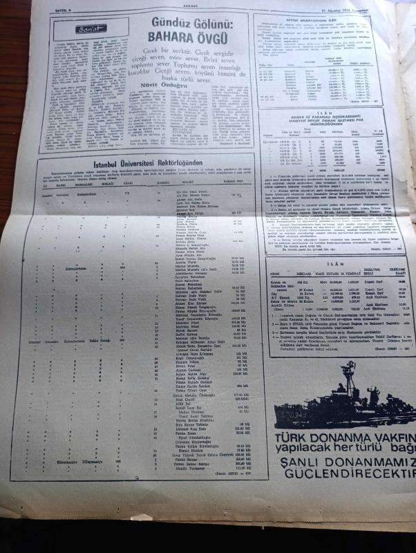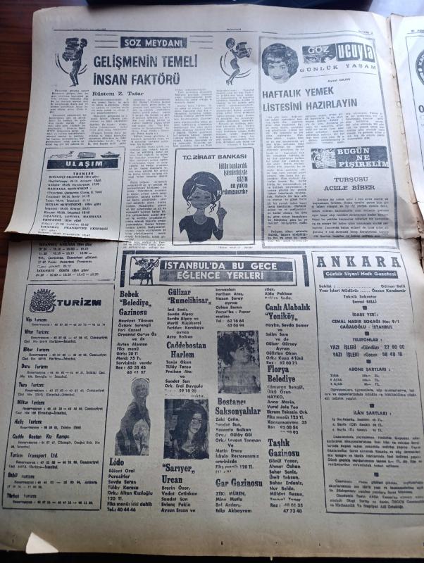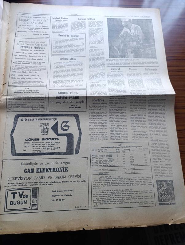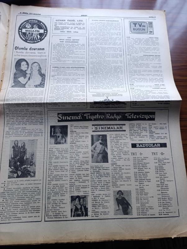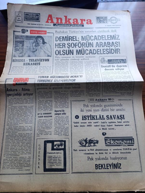 Ankara Gazetesi - Turkish Newspaper - 21 Ağustos 1976 - günün meselesi Ankara Atina gerginliği artıyor - sinemada seks furyası - sinema televizyon rekabeti - Süleyman Demirel mücadelemiz her şoförün arabası olsun mücadelesidir - Yunan hücum botu Hora'yı dürbünle izleyebiliyor - Adalet Partisi ilk Kongresi yarın başlıyor - turizm şirketleri - bebek belediye gazinosunda Hamiyet Yüceses Öztürk Serengil Feri Cansel Ayten Alpman - Gar gazinosunda Zeki Müren Mine Mutlu Edip Akbayram Ajda Pekkan Pakize Suda - Taşlık gazinosunda Gönül Yazar Ahmet Özhan Müjdat Gezen Seyyal Taner - televizyonda bugün - Kara Şahin filmi başrolde Behçet Nacar Güneş sinemasında - bakır delikanlı filmi fitaş sinemasında - Şişli Beşiktaş Kadıköy sinema programı - Gündüz Gölünü bahara övgü yazan Nüvit Özdoğru - Rauf Denktaş Kıbrıslı Türkler artık Rum yönetiminde yaşamayacak dedi - Kıbrıs'ta eğlence yerleri - Kıbrıs yemekleri - Kıbrıs'ta konaklama yerleri - Libya kıbrıs'taki Türkleri destekliyor - Oğuzhan Asiltürk adlı eser, Kitap > Süreli Yayınlar > Gazeteler > Türkiye > Genel > Günlük kategorisinde İkinci El olarak satıştadır.