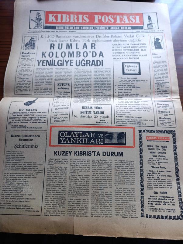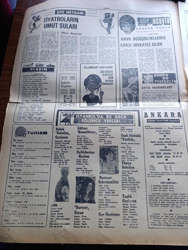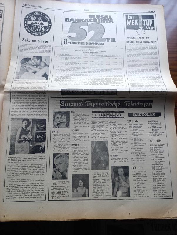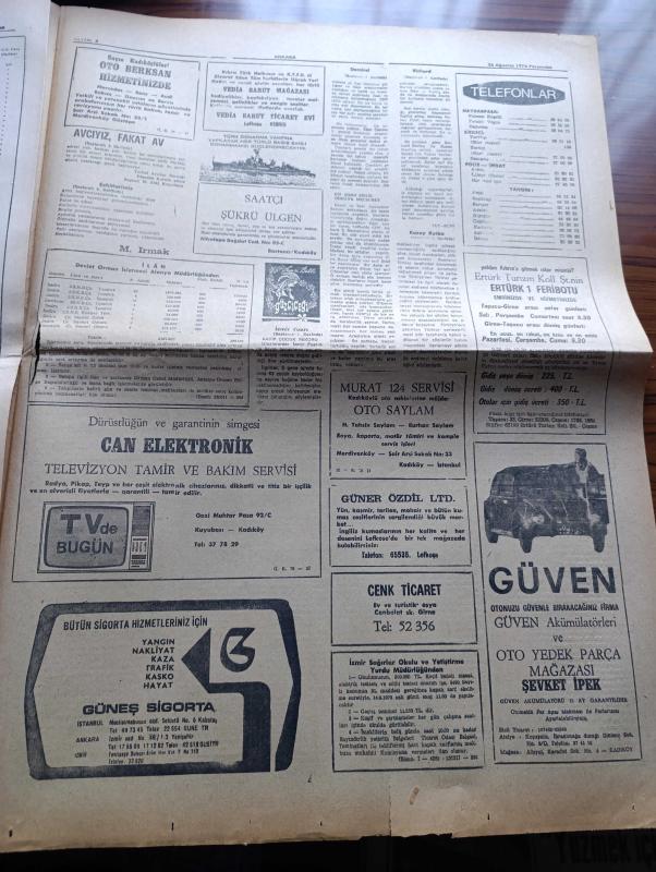 Ankara Gazetesi - Turkish Newspaper - 26 Ağustos 1976 - günün meselesi huzursuzluk denizi - Richard Burton bir mankenle evlendi fotoğraf - Süleyman Demirel Birlik olmaya mecburuz dedi fotoğraf - işten çıkarılan işçi Mehmet Vural patronunu öldürdü - İzmir fuarını 6 günde 548 bin kişi gezdi - bebek belediye gazinosunda Hamiyet Yüceses Öztürk Serengil Feri Cansel Ayten Alpman - Lido'da Bülent Oral Parazitler Sevda Seren - Gar Gazinosu'nda Zeki Müren Mine Mutlu ve Edip Akbayram - Seks ve cinayet - Türkiye İş Bankası - Cemo filmi Yıldız sinemasında - Dağlar kızı Reyhan filmi renk sinemasında - süt kardeşler filmi Reks sinemasında - TRT radyo programı - Saatçi Şükrü Ülgen - Rumlar Kolombo'da yenilgiye uğradı - KTFD Başbakan yardımcısı ve Dışişleri Bakanı Vedat Çelik alınan karar Kıbrıs Türk toplumunun aleyhine değildir dedi - Kıbrıs şiirlerinden seçmeler şehitlerimiz şiiri - Girne Dorona Otel - Lefkoşe açık hava aile gazinosu - Kıbrıs yemekleri - Alasya lokantası - Özsoy gazinosu adlı eser, Kitap > Süreli Yayınlar > Gazeteler > Türkiye > Genel > Günlük kategorisinde İkinci El olarak satıştadır.