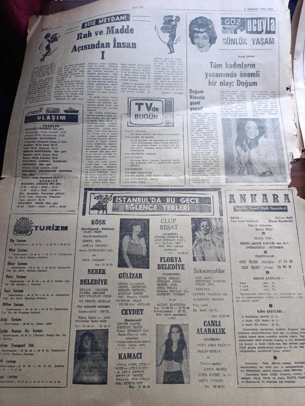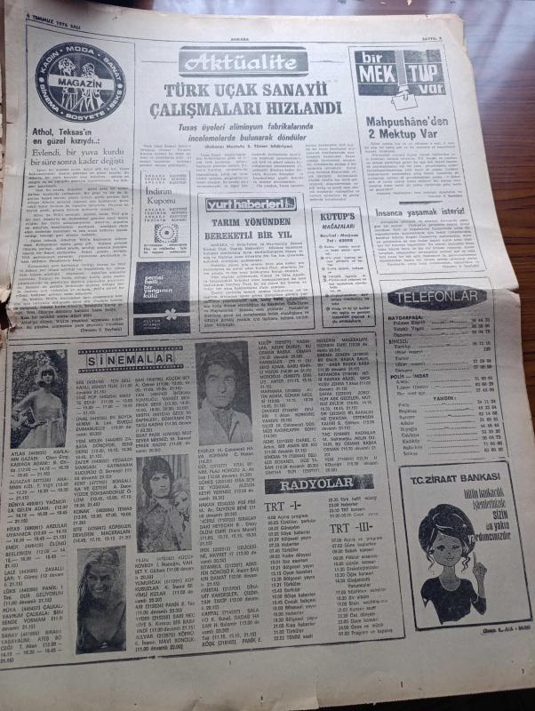 Ankara Gazetesi - Turkish Newspaper - 6 Temmuz 1976 - kadın vücudunun her ada ve parseli yaz günü hava almalı Fotoğrafı - yaşlılar 1977 martında maaş alacak - Kıbrıs Türk Federe Devleti bakanları açıklandı - Kıbrıs Türk Federe Devleti ilk Başbakanı Nejat Konuk Fotoğrafı - Rauf Denktaş yeni kabineyi onayladı Fotoğrafı - Kıbrıs'ta Vedat Çelik savunma dışişleri bakanı ve Başbakan yardımcısı oldu - Kıbrıs'ta Meclis başkanlığı'na seçilen Osman Örek Kıbrıslı Türk gençleri ile Fotoğrafı - Haylo ve yas yılları yazan Şemsi Belli - Çorum köylüleri Çeltik alanı daraldı diye sıkıntı içinde - Bebek belediye gazinosunda Belkıs Özener Fatma Belgen Mut Folklor Ekibi ve Serpil Barlas - Kamacı Gazinosu'nda Nihal Yeşil Turan Engin Ayla Akıncı - Türk uçak sanayii çalışmaları hızlandı - köprü filmi başrolde Kadir İnanır Bulvar sinemasında - Salako filmi başrolde Kemal Sunal Kartal sinemasında - Zapata dönüyor filmi yeni Melek sinemasında - Anuşka şiiri yazan Attila Balkan - hocam caferoğlu yazan Yusuf Ziya adlı eser, Kitap > Süreli Yayınlar > Gazeteler > Türkiye > Genel > Günlük kategorisinde İkinci El olarak satıştadır.