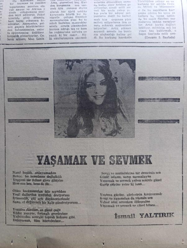 Ankara Gazetesi - Turkish Newspaper - 8 Temmuz 1976 - Elizabeth Taylor ile Zahidi İran'a gidiyor Fotoğrafı - Adalet Partisi genel başkanı Süleyman Demirel Altınözü kongresine mesaj gönderdi - Rauf Denktaş Anadolu Ajansı Kıbrıs bürosunu törenle açtı - Nevzat Tandoğan'ı soyan eşkıya yazan Şemsi Belli - kamboçya'da ölüm ve işkence kol kola - Kızıltoprak köşkte Ülkü Özen Hale Manzade Gönül Gül Atilla Yelken Azra Balkan - saksonyalılarda İnci Sanlı Mihrican Güngör Gülay Gül Papatya - bekar erkeklerin en büyük hayat sigortası evlenmek - televizyonda bugün - kapıkule'de tırlar için ayrı bir yol yapılıyor - dünyanın en tatlı kadını filmi Mıstık sinemasında - en büyük benim başrolde Bruce Lee Ünal sinemasında - Estergon kalesi filmi başrolde Serdar Gökhan Şık sinemasında - hocamız Arif Nihat Asya'nın ruhuna mektup yazan Hüseyin Rahmi Kılıç - duramayacağım seni öpmeden Yazan Yunus Yaşar - orman şiiri yazan Mehmet Karabulut - yaşamak ve sevmek şiiri Yazan İsmail Yaltırık - Kıbrıs trajedisi, Gülsen Belli tarafından kaleme alınmıştır. Ankara Gazetesi - Turkish Newspaper - 8 Temmuz 1976 - Elizabeth Taylor ile Zahidi İran'a gidiyor Fotoğrafı - Adalet Partisi genel başkanı Süleyman Demirel Altınözü kongresine mesaj gönderdi - Rauf Denktaş Anadolu Ajansı Kıbrıs bürosunu törenle açtı - Nevzat Tandoğan'ı soyan eşkıya yazan Şemsi Belli - kamboçya'da ölüm ve işkence kol kola - Kızıltoprak köşkte Ülkü Özen Hale Manzade Gönül Gül Atilla Yelken Azra Balkan - saksonyalılarda İnci Sanlı Mihrican Güngör Gülay Gül Papatya - bekar erkeklerin en büyük hayat sigortası evlenmek - televizyonda bugün - kapıkule'de tırlar için ayrı bir yol yapılıyor - dünyanın en tatlı kadını filmi Mıstık sinemasında - en büyük benim başrolde Bruce Lee Ünal sinemasında - Estergon kalesi filmi başrolde Serdar Gökhan Şık sinemasında - hocamız Arif Nihat Asya'nın ruhuna mektup yazan Hüseyin Rahmi Kılıç - duramayacağım seni öpmeden Yazan Yunus Yaşar - orman şiiri yazan Mehmet Karabulut - yaşamak ve sevmek şiiri Yazan İsmail Yaltırık - Kıbrıs trajedisi adlı eser Türkçe dilindedir.