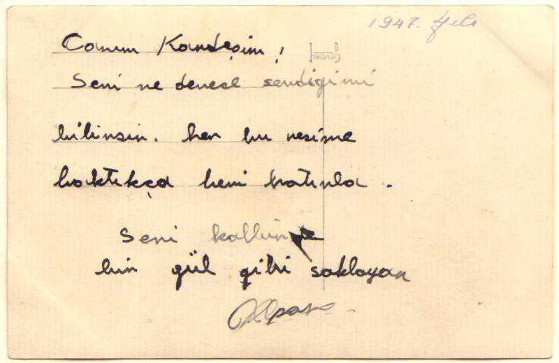 Ankara Kız Enstitüsü talebelerinden bir grup. Arkada, 1948 yılı kaydı ve kısa bir hitap yazısı var.