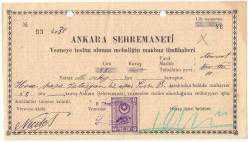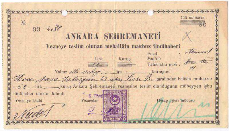6 Teşrinievvel 1930 tarihli Ankara Şehremaneti tarafından kesilmiş makbuz. İmzalı ve damga pullu. Üst kısımda zımba delikleri var. Ayrıca arka kısımda Osmanlıca kısa not yazılmış.