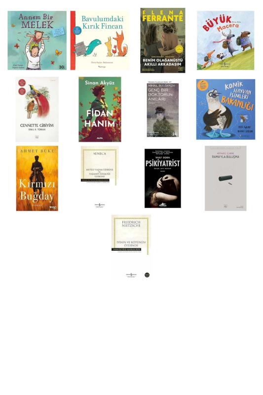 Annem Bir Melek - Bavulumdaki Kırık Fincan - Benim Olağanüstü Akıllı Arkadaşım: Napoli Romanları - Birinci Kitap - Büyük Macera - Cennette Gibiyim - Fidan Hanım - Genç Bir Doktorun Anıları: Modern Klasikler Serisi - Komik Hayvan İsimleri Bakanlığı - Kırmızı Buğday - Mutlu Yaşam Üzerine - Yaşamın Kısalığı Üzerine - Psikiyatrist - Rama’yla Buluşma - İyinin ve Kötünün Ötesinde: Hasan Ali Yücel Klasikler Dizisi