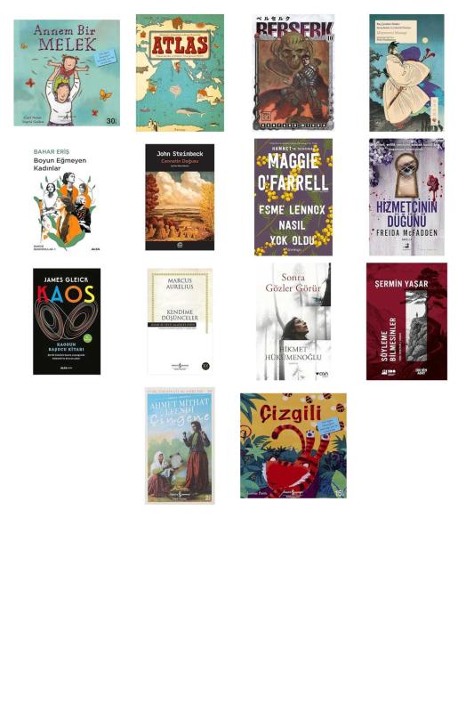 Annem Bir Melek - Atlas (Ciltli): Kıtalar, Denizler ve Kültürler Arası Yolculuk Rehberi - Berserk 10 - Beş Çember Kitabı - Boyun Eğmeyen Kadınlar: Dahice Dedikodular - 1 - Cennetin Doğusu - Esme Lennox Nasıl Yok Oldu - Hizmetçinin Düğünü - Kaos: Kaosun Başucu Kitabı - Kendime Düşünceler: Hasan Ali Yücel Klasikler Dizisi - Sonra Gözler Görür - Söyleme Bilmesinler - Çingene: Türk Edebiyatı Klasikleri - 20 - Çizgili