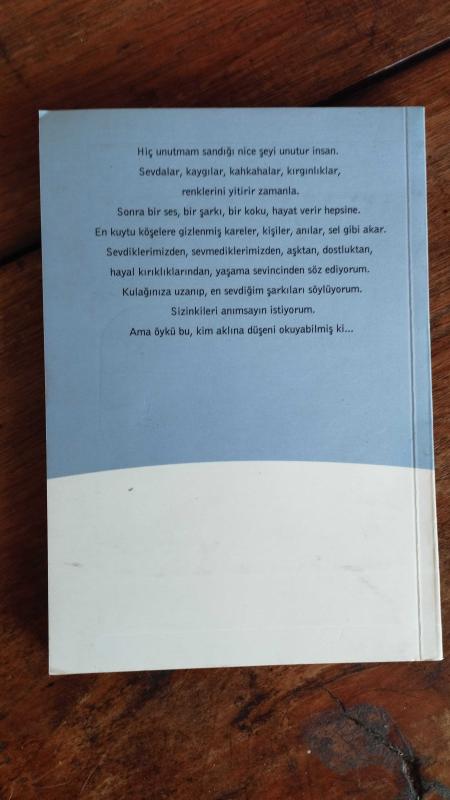 Hiç unutmam sandığı nice şeyi unutur insan. Sevdalar, kaygılar, kahkahalar, kırgınlıklar, renklerini yitirir zamanla. Sonra bir ses, bir şarkı, bir koku, hayat verir hepsine. En kuytu köşelere gizlenmiş kareler, kişiler, anılar, sel gibi akar. Sevdiklerimizden, sevmediklerimizden, aşktan, dostluktan, hayal kırıklıklarından, yaşama sevincinden söz ediyorum. Kulağınıza uzanıp, en sevdiğim şarkıları söylüyorum. Sizinkileri anımsayın istiyorum. Ama öykü bu, kim aklına düşeni okuyabilmiş ki...