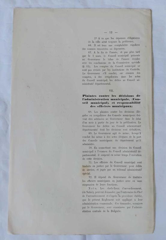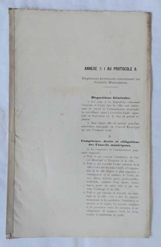 Kitap 1878 yılında yayınlanmıştır. 12 sayfadır. Annexe No: 1 Au Protocole No 8. / Reglement provisoire concernant les Conseils Municipaux [Belediye Meclislerine Dair Geçici Yönetmelik] adlı eser Fransızca dilindedir.