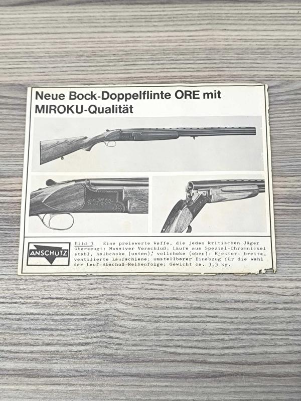 Alman üretici Anschütz tarafından tanıtımı yapılan ORE model çifte av tüfeğine ait reklam ve tanıtım kartı. Broşürde tüfeğin farklı açılardan görselleri ve teknik özellikleri yer almakta olup “Miroku kalite” ibaresi dikkat çekmektedir. Avcılık tarihi, silah koleksiyonculuğu ve reklam efemeralarıyla ilgilenen koleksiyonerler için ilgi çekici bir parçadır.