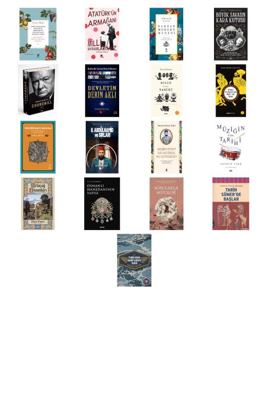 Antik Çağlardan Günümüze Bitkiler ve Hayvanların Kültür Tarihi - Atatürk’ün Armağanı Milli Bayramlarımız - Barbar Modern Medeni - Büyük Savaş'ın Kara Kutusu - Churchill (Ciltli) - Devletin Derin Aklı - Dilin Kısa Tarihi - Eski Yunan'da Mit ve Din - Gizli Bilimlerin Serüveni - II. Abdülhamid ve Sırları - Meşrutiyet Ne Getirdi Ne Götürdü? - Müziğin Kısa Tarihi - Ortaçağ İnsanları - Osmanlı Hanedanının Yapısı - Sorularla Mitoloji - TARİH SÜMERDE BAŞLAR - Türk Hava Harp Sanayii Tarihi